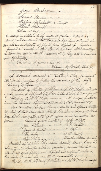 He advised the councellors to be wise and judicious in all their movements and not hasty in their transactions; as for his faith it was the same as ever, and he fellowshiped all such as loved the gospel of our Lord and Saviour Jesus Christ in act as well as deed word. (Minute Book 2, 13 Dec. 1838)