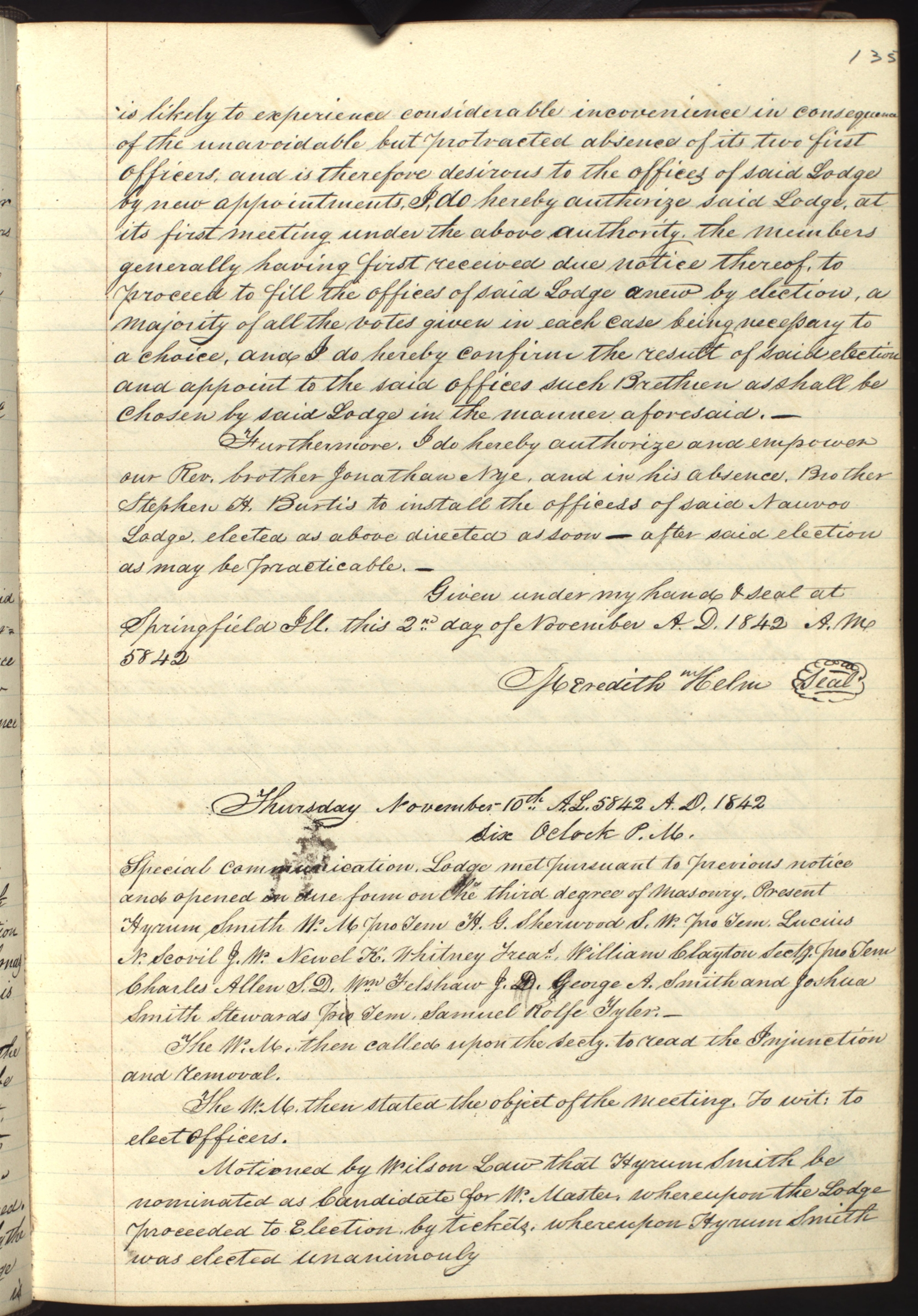 Nauvoo Lodge under Dispensation, Minutes, [, Hancock Co., IL], 10 Nov. 1842. Version copied [ca. 10 Nov. 1842] in Nauvoo Masonic Lodge Minute Book, 135–[137]; handwriting of ; CHL.