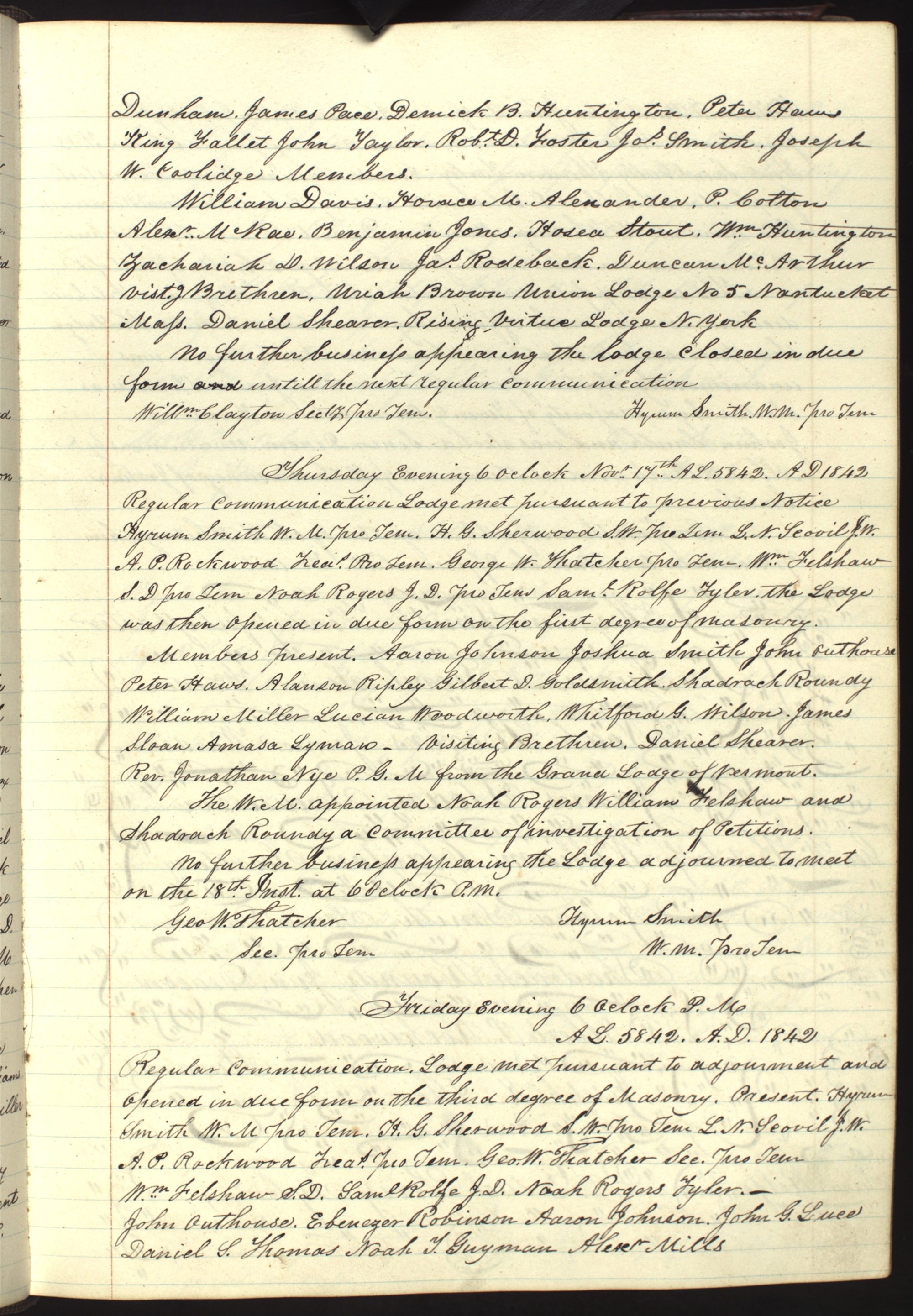 Nauvoo Lodge under Dispensation, Minutes, [, Hancock Co., IL], 10 Nov. 1842. Version copied [ca. 10 Nov. 1842] in Nauvoo Masonic Lodge Minute Book, 135–[137]; handwriting of ; CHL.