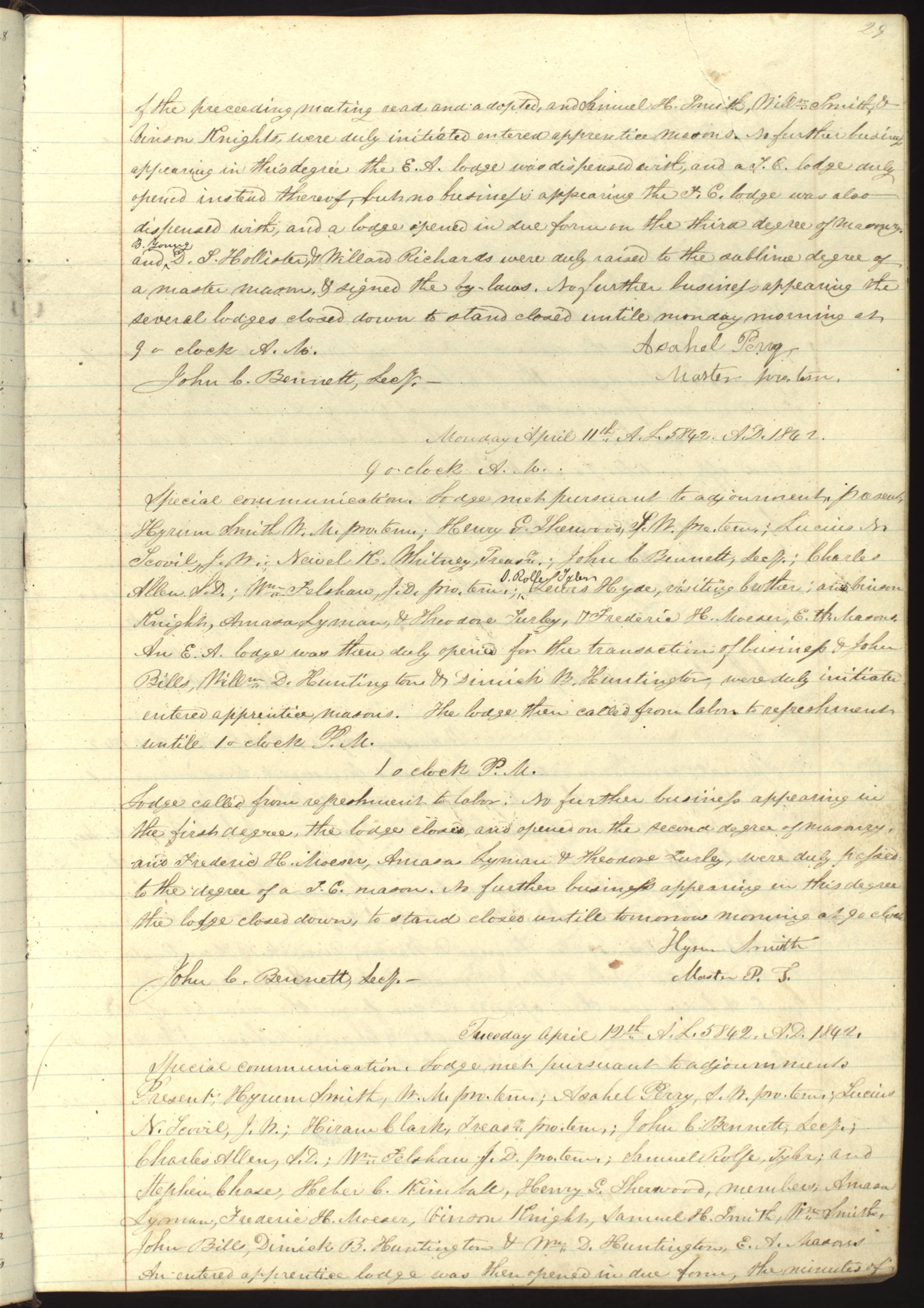 Nauvoo Lodge under Dispensation, Minutes, [, Hancock Co., IL], 12 Apr. 1842. Version copied [ca. May 1842] in Nauvoo Masonic Lodge Minute Book, 29-30; handwriting of ; CHL.