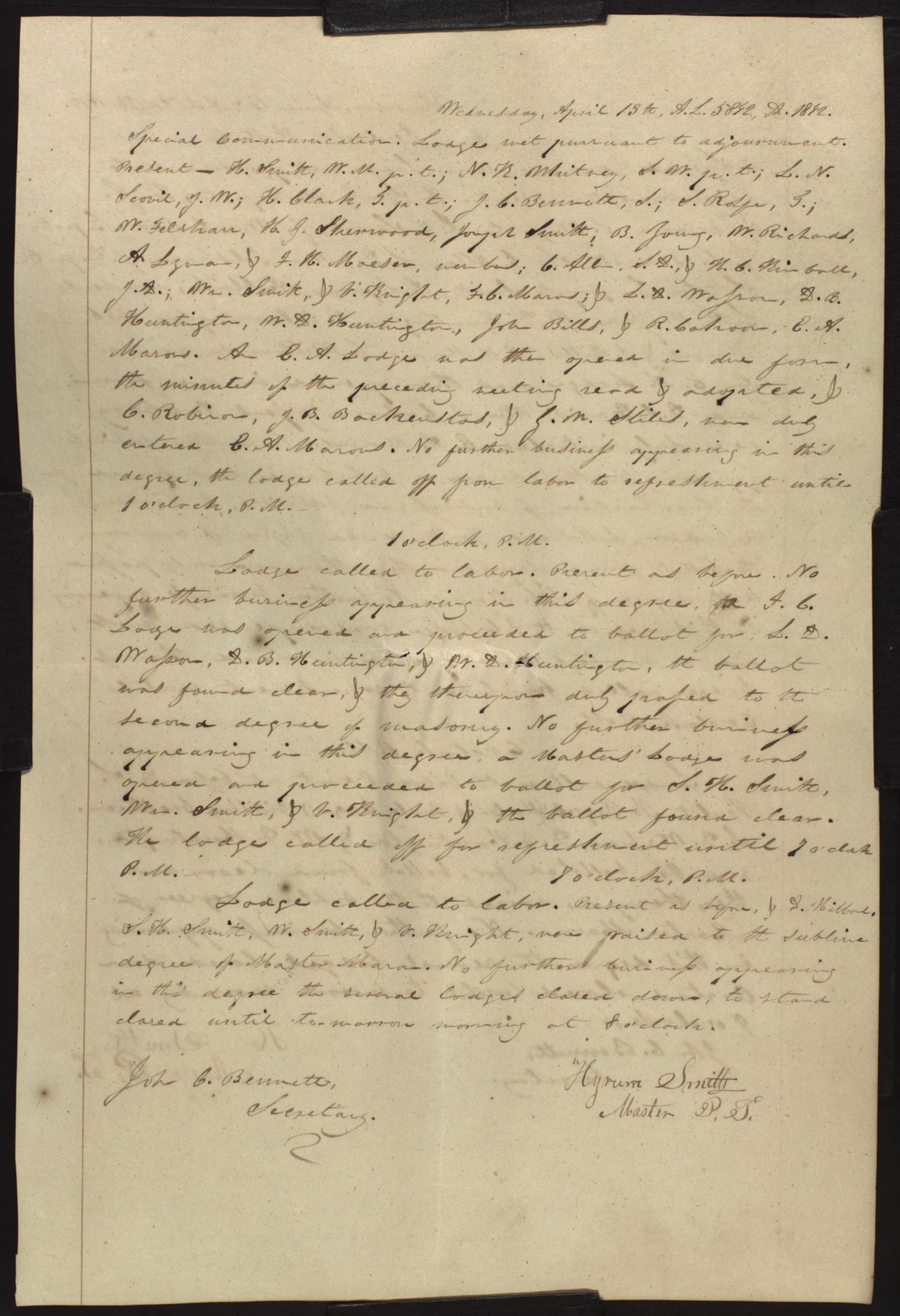 Special Communication. Lodge met pursuant to adjournment. Present — , W. M. p. t.; , S. W. p. t.; , J. W.; , T. p. t.; , S.; , T.; , , Joseph Smith, , , , & , members; , S. D., & , J. A.; , & , F. C. Masons; & , , , , & , E. A. Masons. A C. A. Lodge was then opened in due form, the minutes of the preceding meeting read & adopted, & , , & G. N. Stiles, were duly entered C. A. Masons. No further business appearing in this degree, the lodge called off from labor to refreshment until 1 o’clock, P. M.