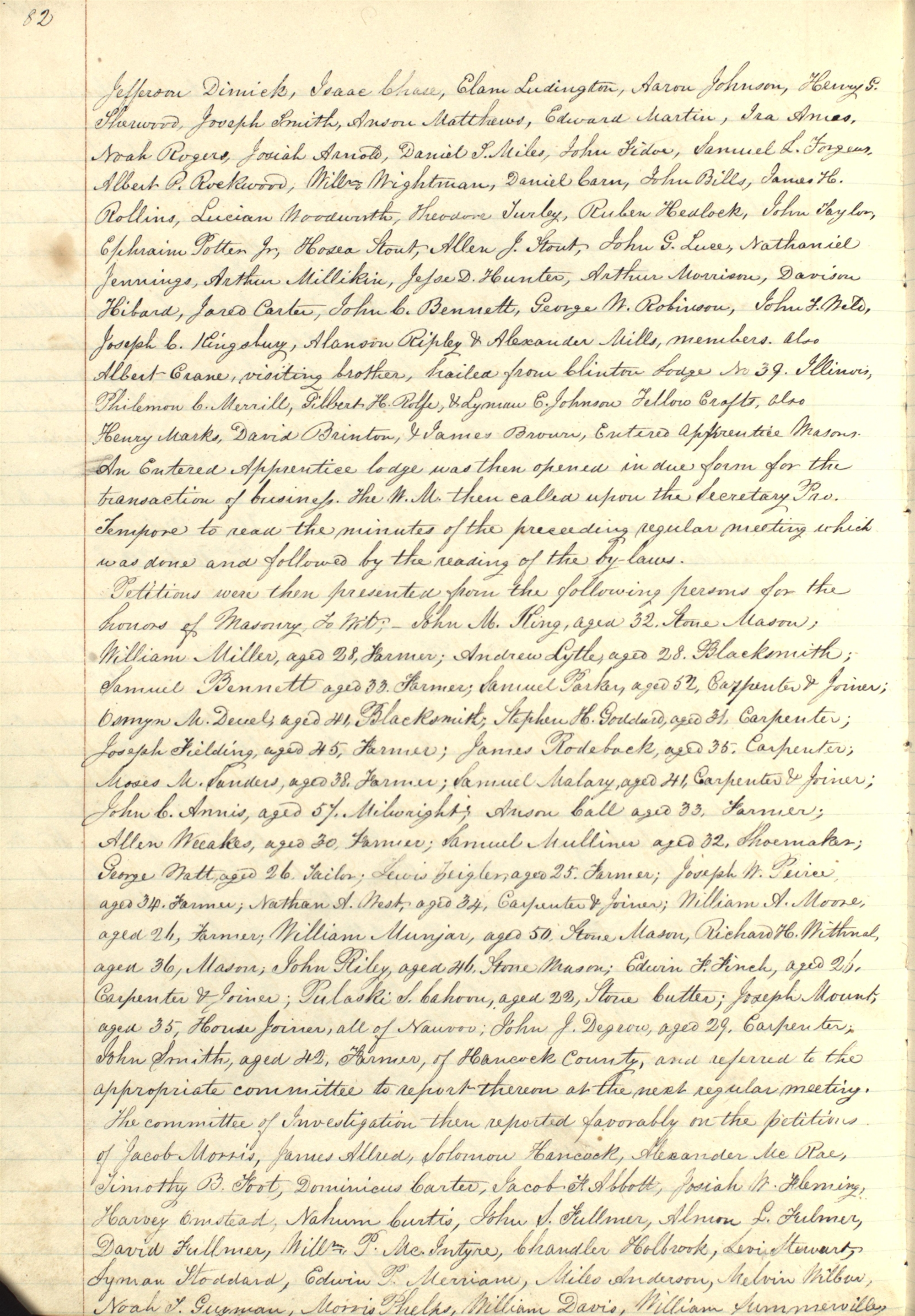 , , Elam Ludington, , , Joseph Smith, , , , , , , , Samuel L. Forgeus, , , , , , , , , , , , , John G. Luce, , , , , , , , , , , & , members. Also Albert Crane, visiting brother, hailed from Clinton Lodge No 39. , , Gilbert H. Rolfe, & Fellow Crafts, also Henry Marks, , & , Entered Apprentice Masons. An Entered Apprentice lodge was then opened in due form, for the transaction of business. The W.M. then called upon the Secretary Pro. Tempore to read the minutes of the preceeding regular meeting which was done and followed by the reading of the by-laws. Petitions were then presented from the following persons for the honors of Masonry, To Wit;— John M. King, aged 32. Stone Mason; William Miller, aged 28, Farmer; , aged 28. Blacksmith; aged 33. Farmer; Samuel Parker, aged 52, Carpenter & Joiner; Osmyn M. Deuel, aged 41, Blacksmith; , aged 31, Carpenter; , aged 45, Farmer; James Rodeback, aged 35. Carpenter; , aged 38, Farmer; Samuel Malary, aged 41, Carpenter & Joiner; , aged 57, Milwright; aged 33, Farmer; , aged 30, Farmer; aged 32, Shoemaker; , aged 26, Tailor; , aged 25, Farmer; Joseph W. Peirce, aged 34, Farmer; , aged 34, Carpenter & Joiner; William A. Moore, aged 24, Farmer; , aged 50, Stone Mason, Richard H. Withnal, aged 36, Mason; John Riley, aged 46, Stone Mason; Edwin F. Finch, aged 26, Carpenter & Joiner; , aged 22, Stone Cutter; Joseph Mount, aged 35, House Joiner, all of ; John J. Degrow, aged 29, Carpenter; John Smith, aged 42, Farmer, of , and referred to the appropriate committee to report thereon at the next regular meeting. The committee of Investigation then reported favourably on the petitions of , , , , , Dominicus Carter, Jacob F. Abbott,, Josiah W. Fleming, , , , , , , , Levi Stewart, , Edwin P. Merriam, , , , Morris Phelps, William Davis, William Summerville, [p. 82]