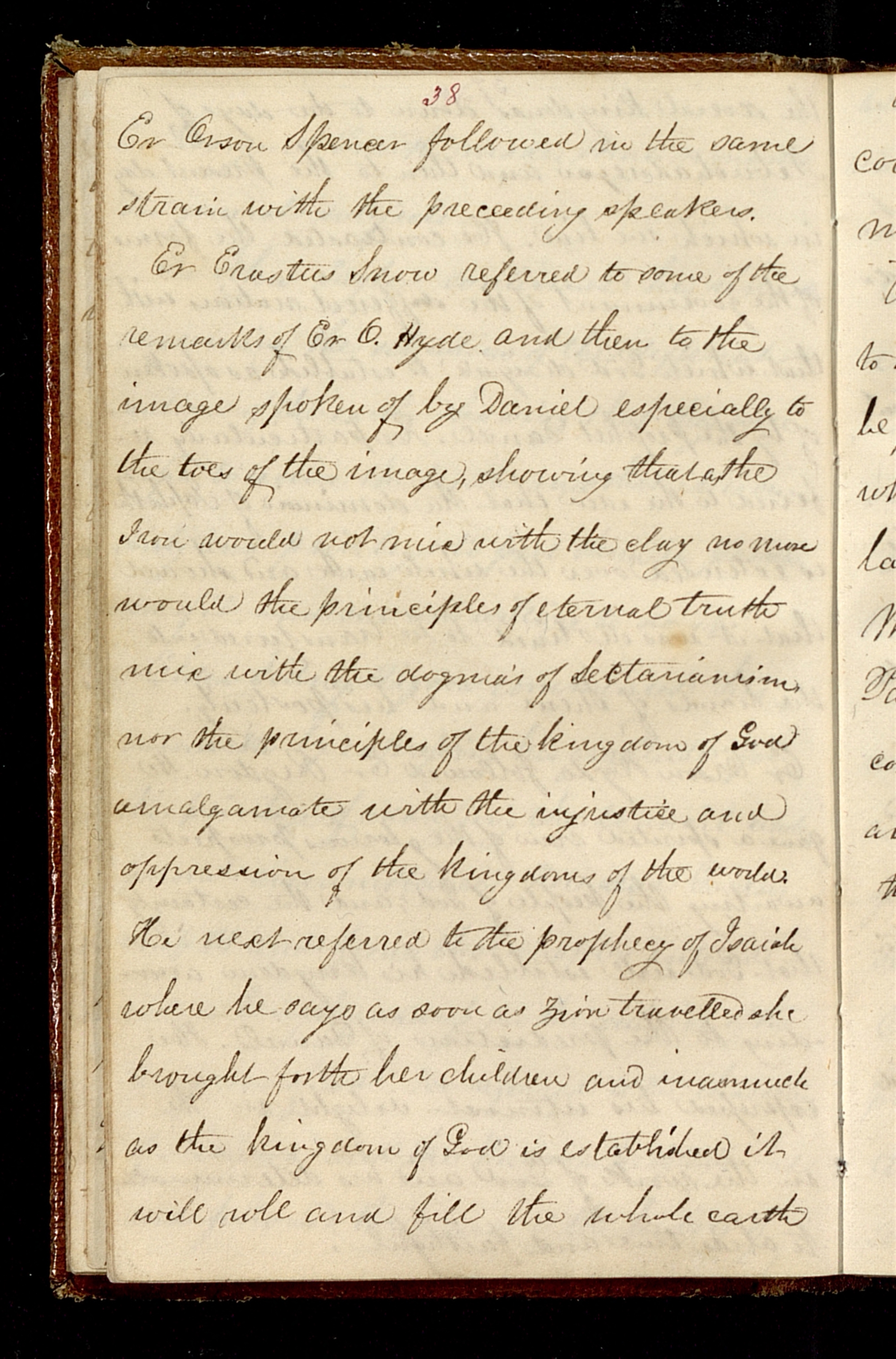 Er referred to some of the remarks of Er and then to the image spoken of by Daniel especially to the toes of the image, showing that <as> the Iron would not mix with the clay no more would the principles of eternal truth mix with the dogma’s of Sectarianism, nor the principles of the kingdom of God amalgamate with the injustice and oppression of the kingdoms of the world. He next referred to the prophecy of Isaiah where he says as soon as Zion travelled she brought forth her children and inasmuch as the kingdom of God is established it will roll and fill the whole earth [p. [38]]