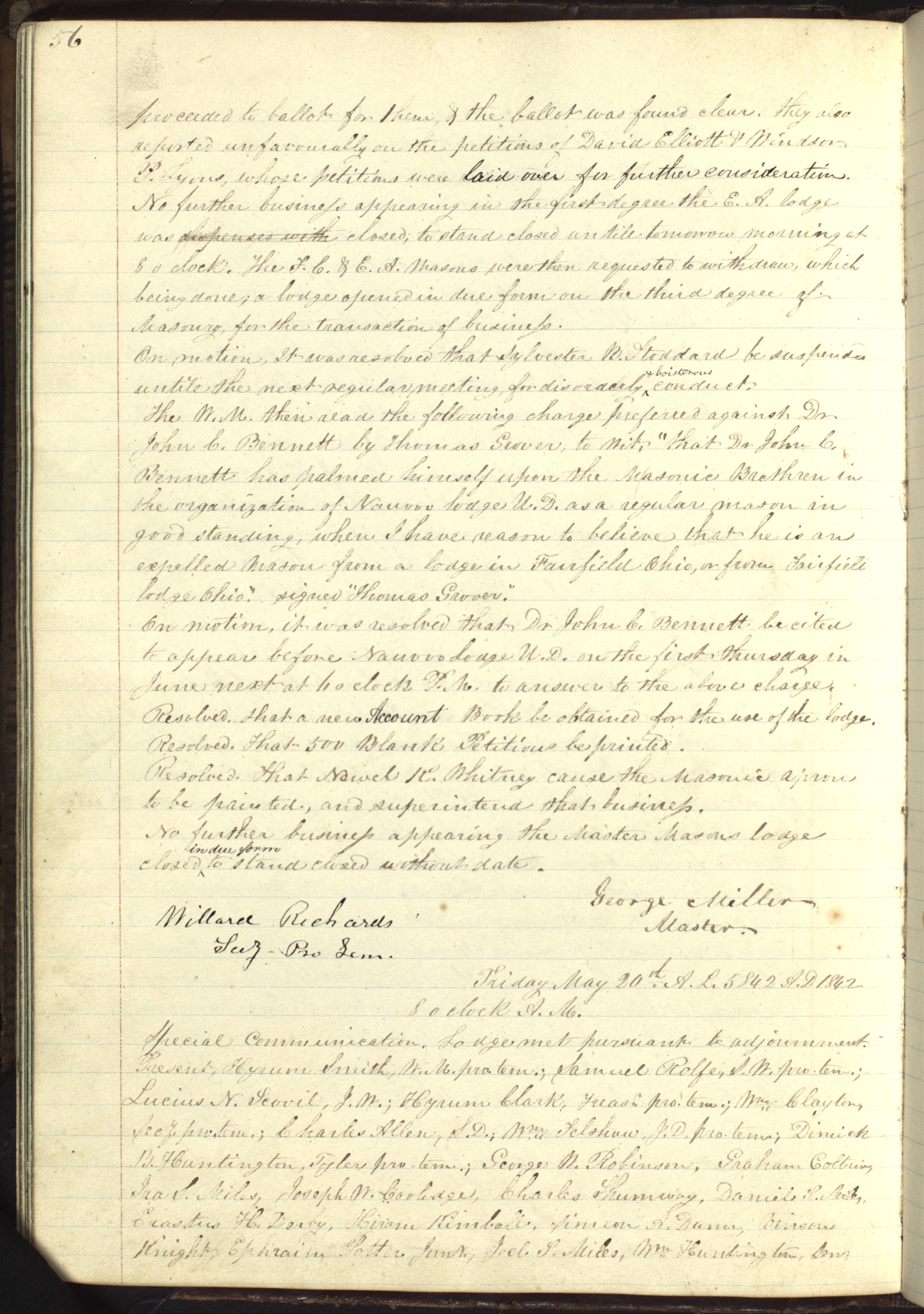 Nauvoo Lodge under Dispensation, Minutes, [, Hancock Co., IL], 20 May 1842. Version copied [ca. 20 May 1842] in Nauvoo Masonic Lodge Minute Book, 56–57; handwriting of ; CHL.