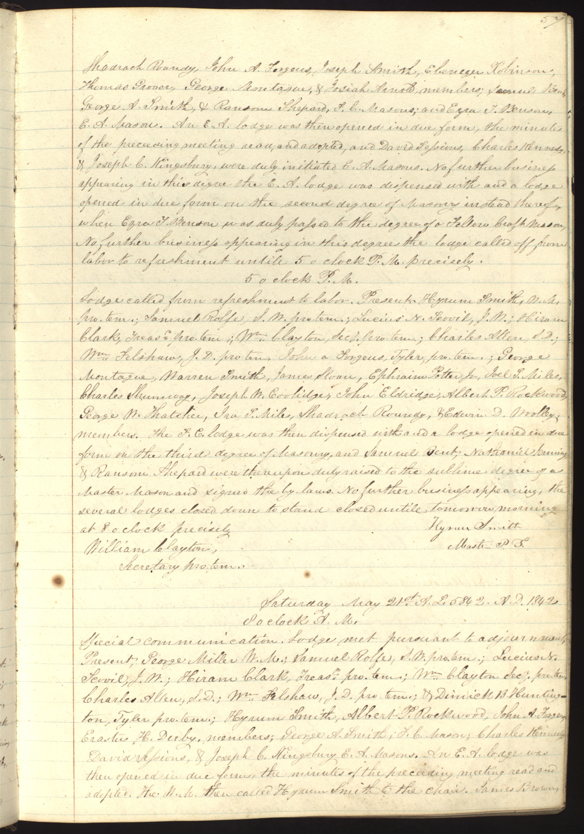 , , Joseph Smith, , , George Montague, & , members; , & , F.C. Masons; and , E.A. Mason. An E. A. lodge was then opened in due form, the minutes of the preceeding meeting read, and adopted, and , , & , were duly initiated E.A. Masons. No further business appearing in this degree the E. A. lodge was dispensed with, and a lodge opened in due form on the second degree of Masonry instead therof, when was duly passed to the degree of a Fellow Craft Mason. No further business appearing in this degree the lodge called off from labor to refreshment until 5 o clock P.M. precisely.