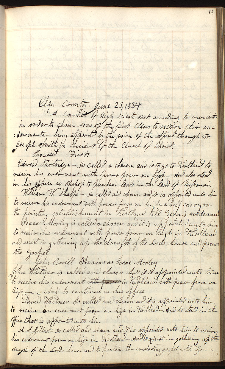 A March 1831 revelation instructed John Whitmer to “Keep the Church Record & History continually.” An April 1831 conference of elders appointed Whitmer to the position of church historian. (Revelation, ca. 8 Mar. 1831–B [D&C 47:3]; Minute Book 2, 9 Apr. 1831.)