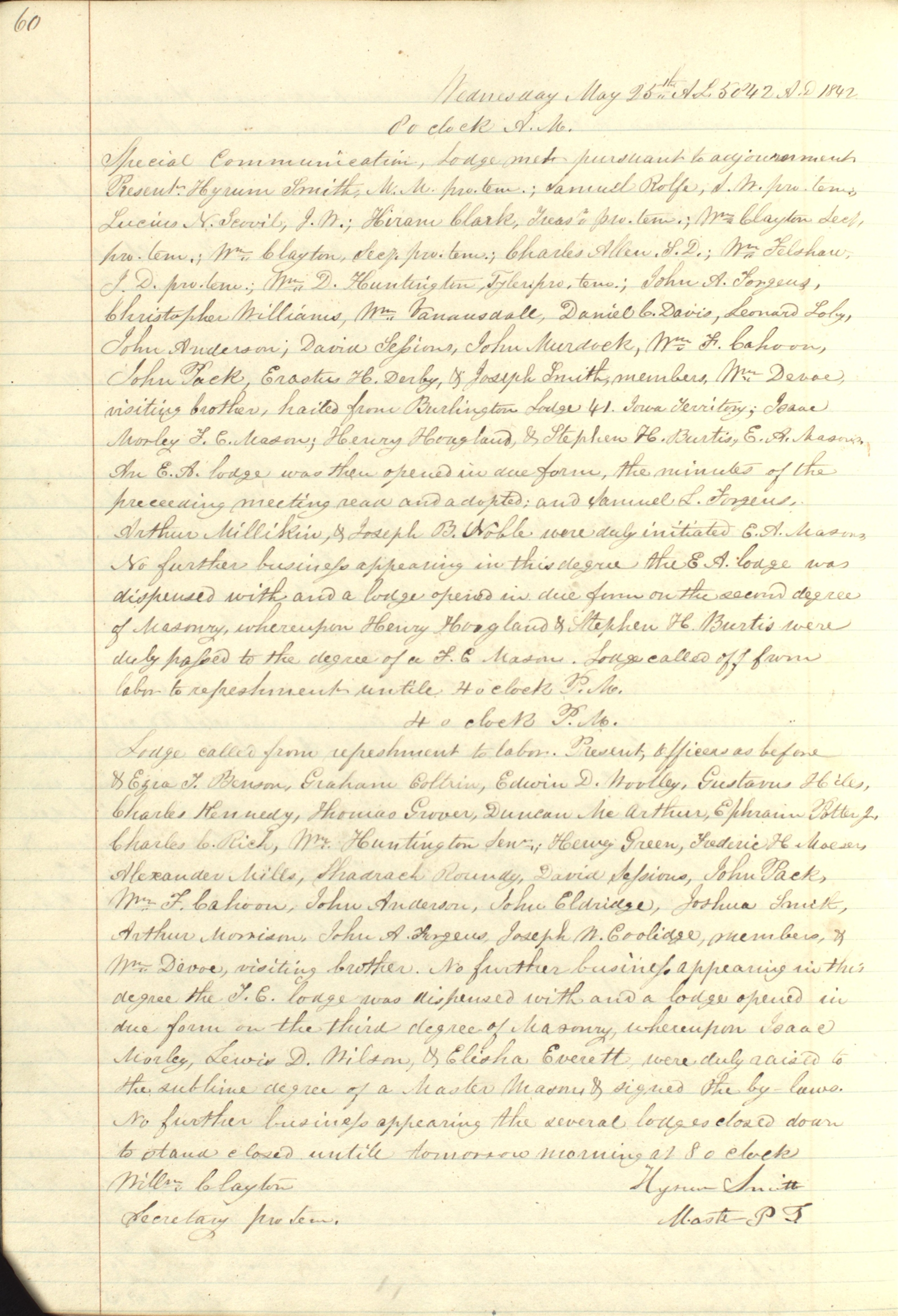 Nauvoo Lodge under Dispensation, Minutes, [, Hancock Co., IL], 25 May 1842. Version copied [25 May 1842] in Nauvoo Masonic Lodge Minute Book, 60; handwriting of ; CHL.