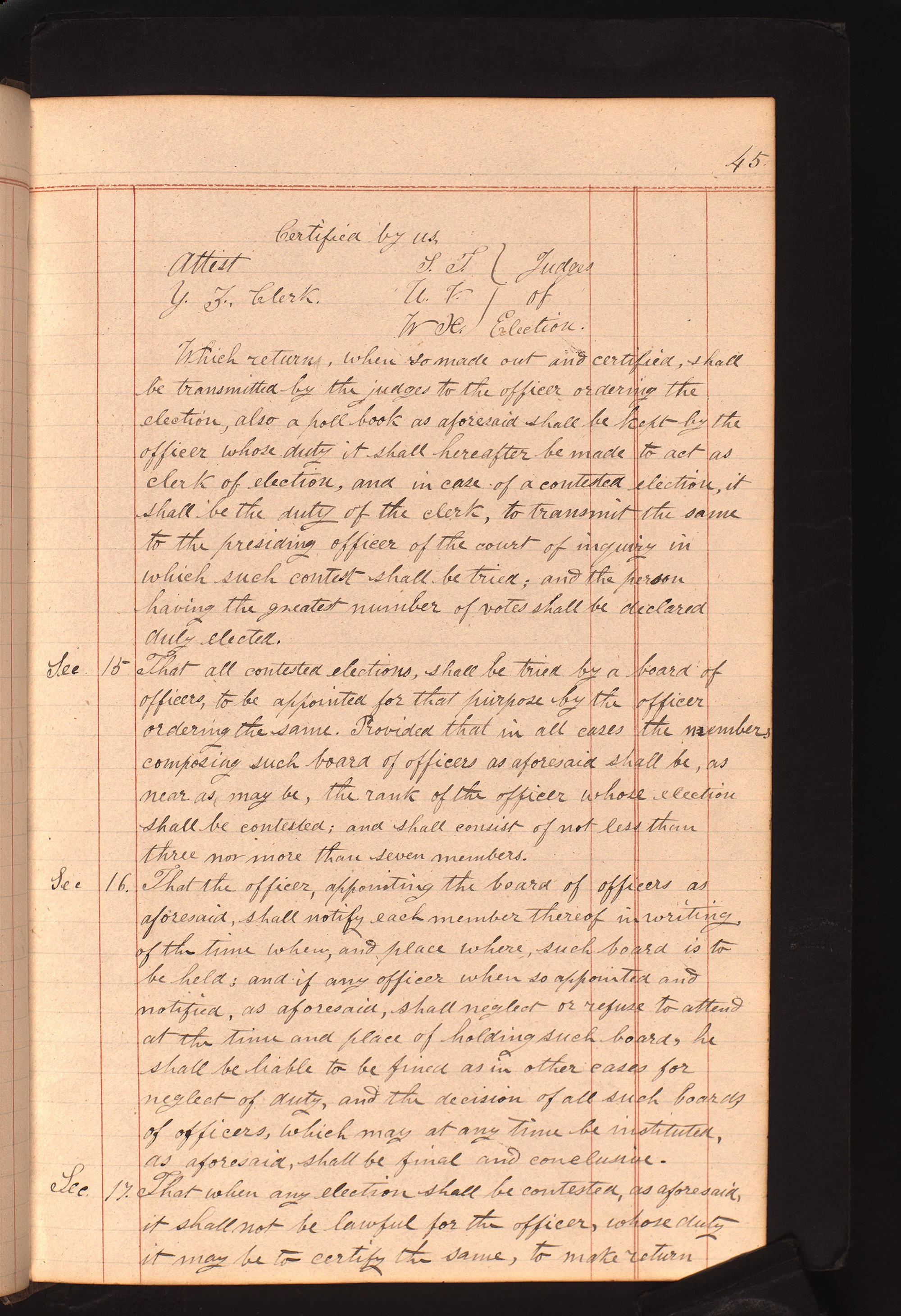 Sec 15 That all contested elections, shall be tried by a board of officers, to be appointed for that purpose by the officer ordering the same. Provided that in all cases the numbers <members> composing such board of officers as aforesaid shall be, as near as may be, the rank of the officer whose election shall be contested; and shall consist of not less than three nor more than seven members.