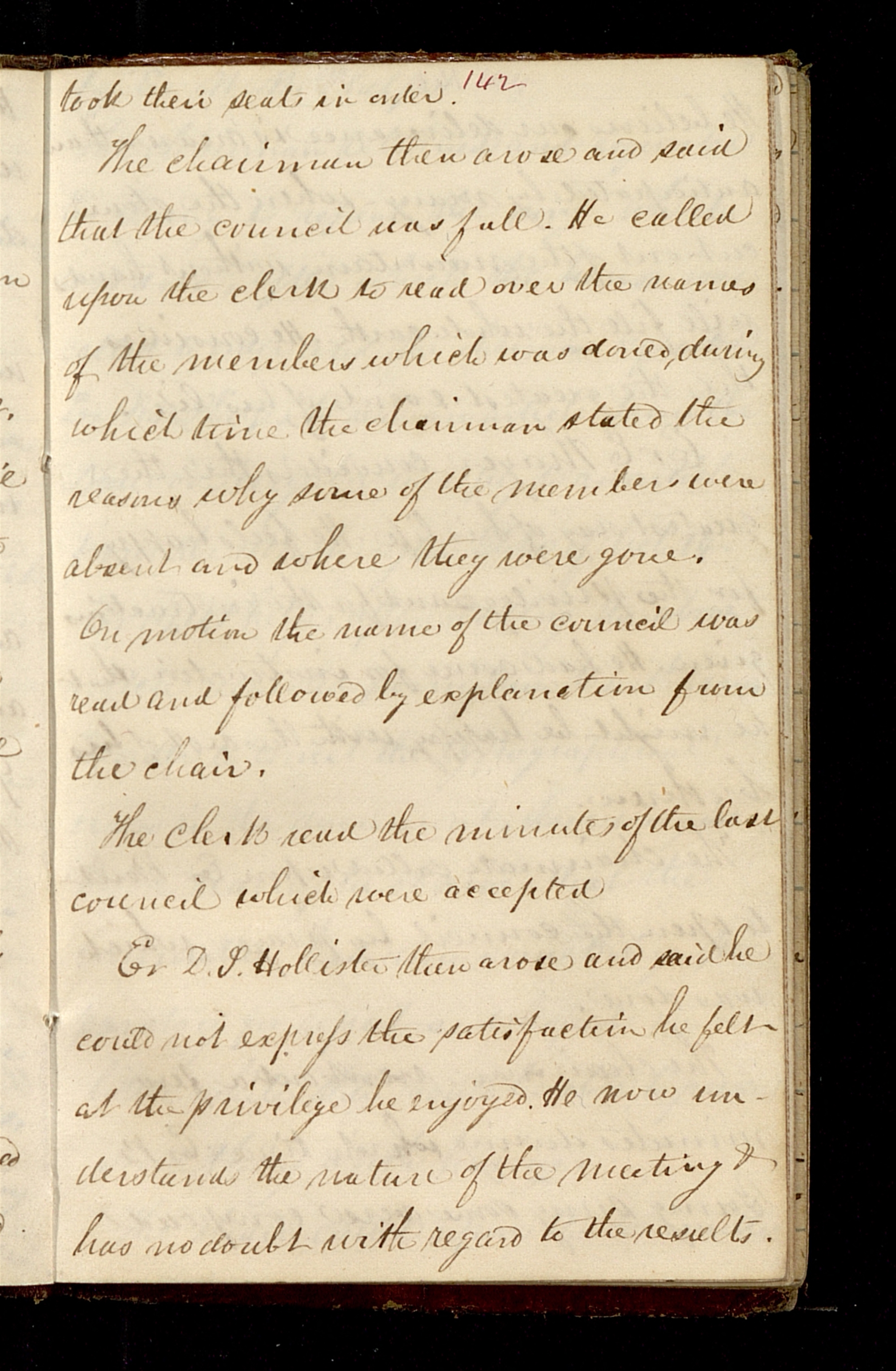 Er then arose and said he could not express the satisfaction he felt at the privilege he enjoyed. He now understands the nature of the meeting & has no doubt with regard to the results. [p. [143]]