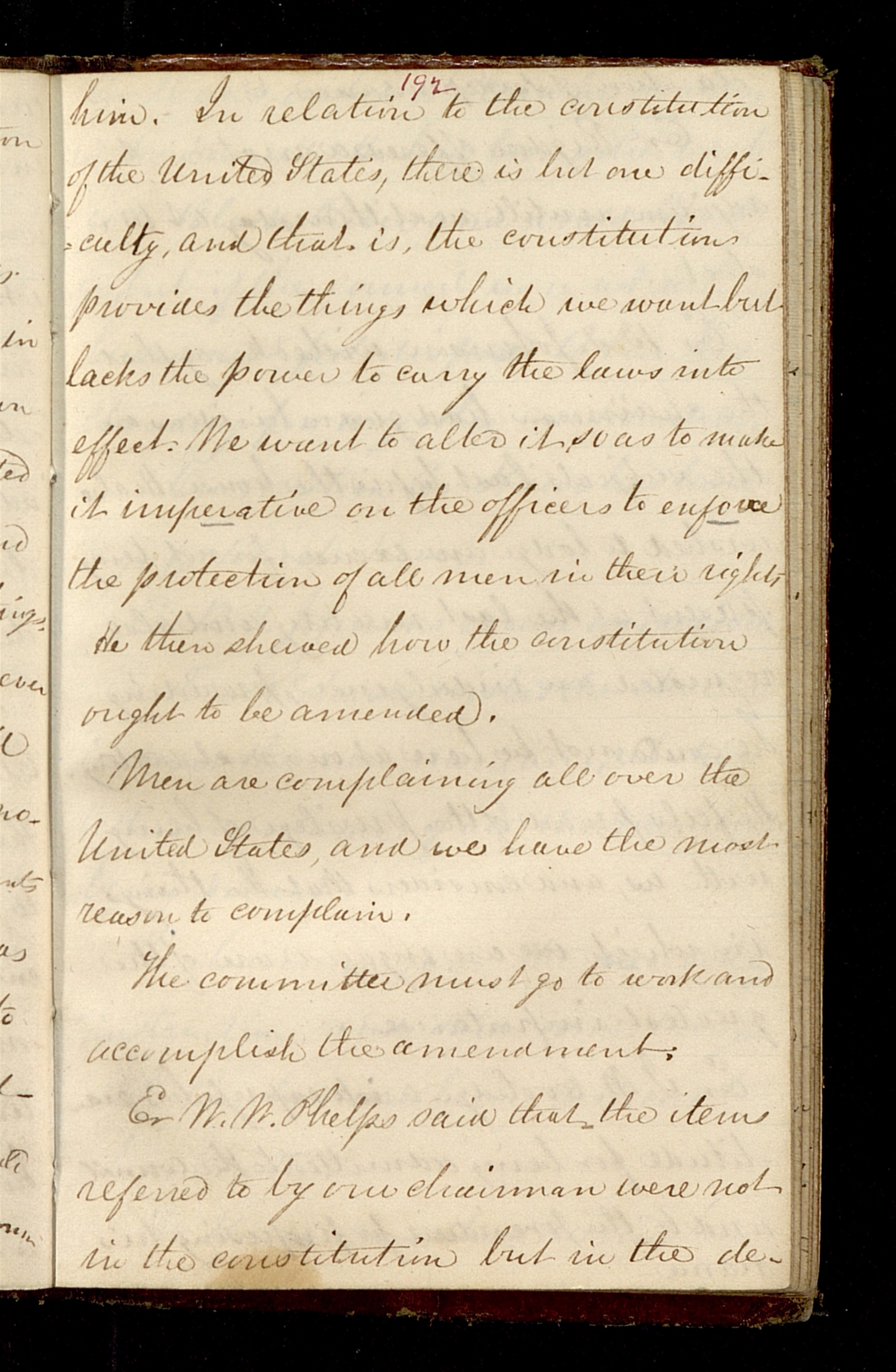 him. In relation to the constitution of the , there is but one difficulty, and that is, the constitution provides the things which we want but lacks the power to carry the laws into effect. We want to alter it so as to make it imperative on the officers to enforce the protection of all men in their rights