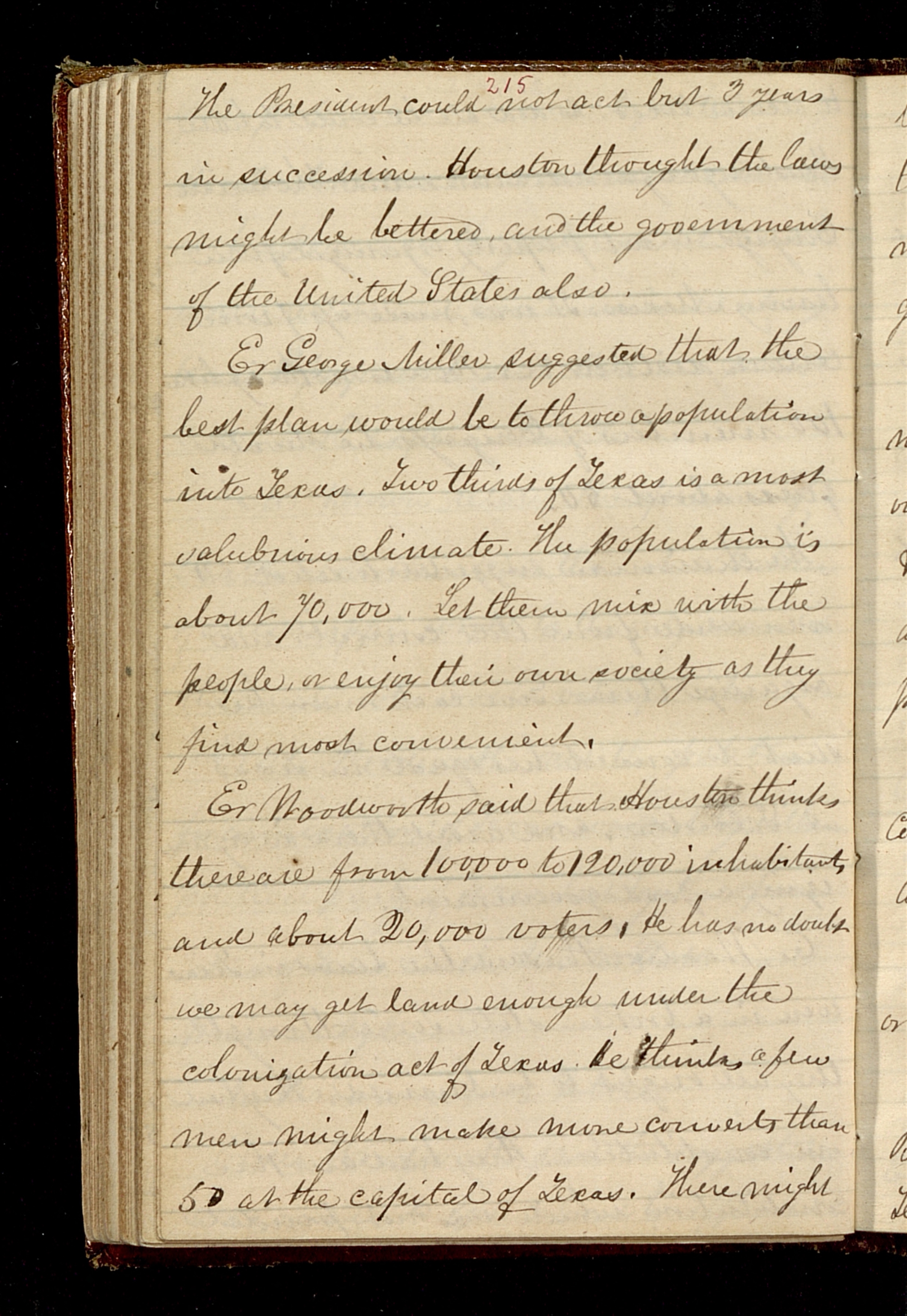 said that thinks there are from 100,000 to 120,000 inhabitants and about 20,000 voters. He has no doubt we may get land enough under the colonization act of . He thinks a few men might make more converts than 50 at the capital of . There might [p. [226]]