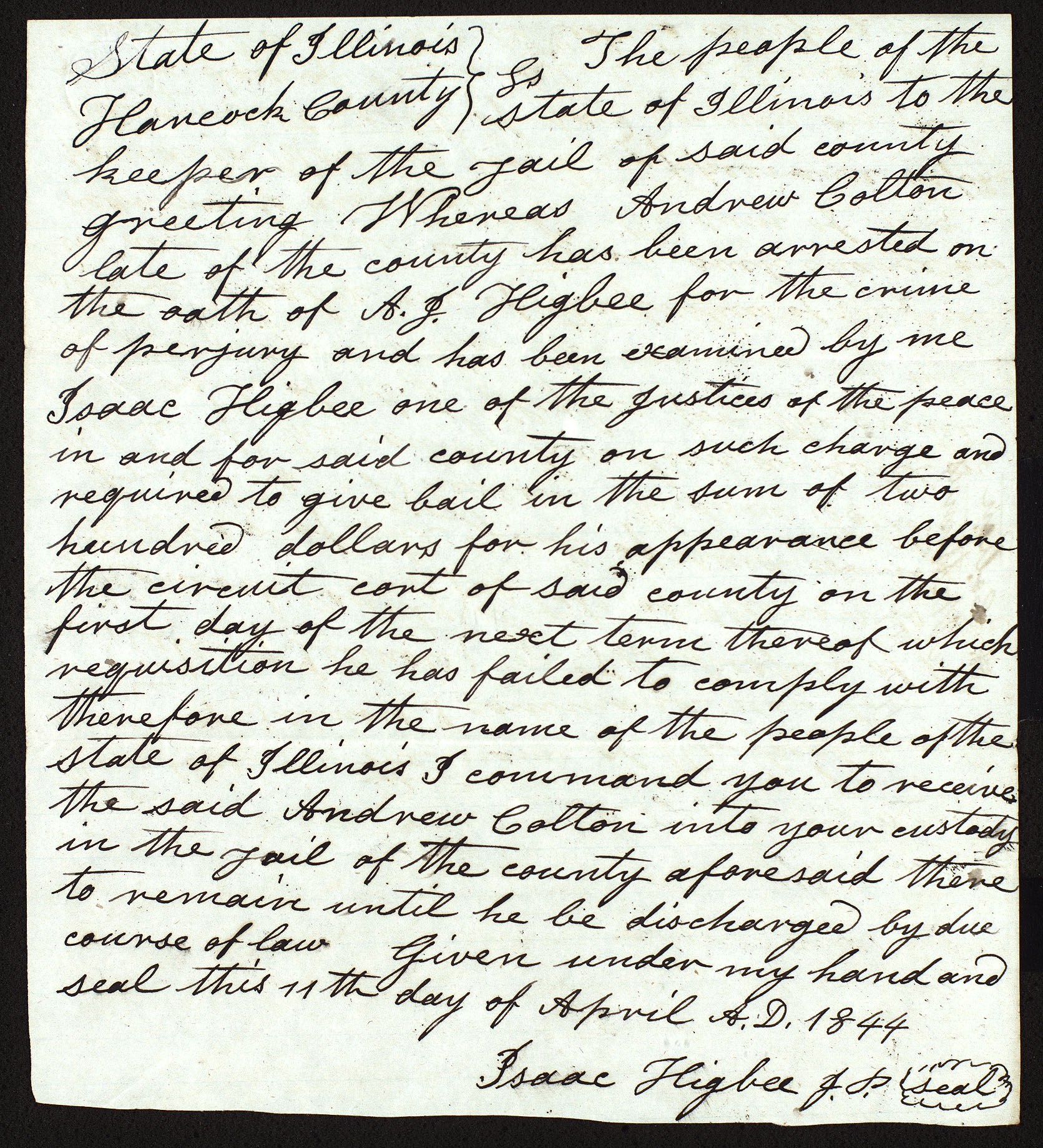 The people of the state of to the of the jail of said greeting Whereas late of the has been arrested on the oath of A[ndrew] J. Higbee for the crime of perjury and has been examined by me one of the Justices of the peace in and for said on such charge and required to give bail in the sum of two hundred dollars for his appearance before the circuit cort of said on the first day of the next term thereof which requisition he has failed to comply with therefore in the name of the people of the state of I command you to receive the said into your custody in the jail of the aforesaid there to remain until he be discharged by due course of law Given under my hand and seal this 11th day of April A. D. 1844