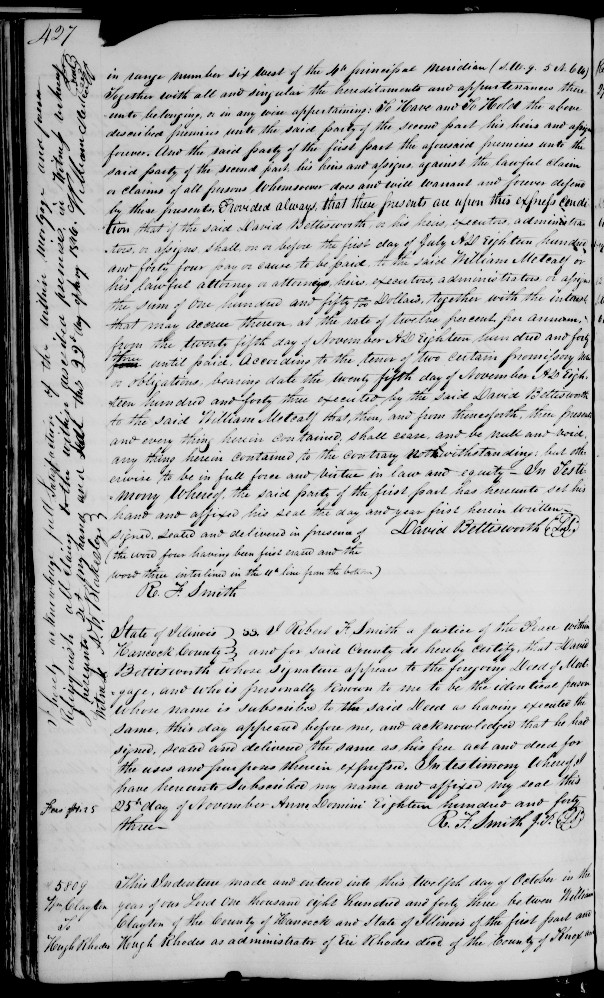 , Mortgage for property in , IL, to Hugh Rhodes, 12 Oct. 1843. Version copied 29 Nov. 1843 in Hancock County, IL, Bonds and Mortgages, vol. 1, pp. 427–429; unidentified handwriting; Hancock County Courthouse, Carthage, IL; microfilm at FHL.