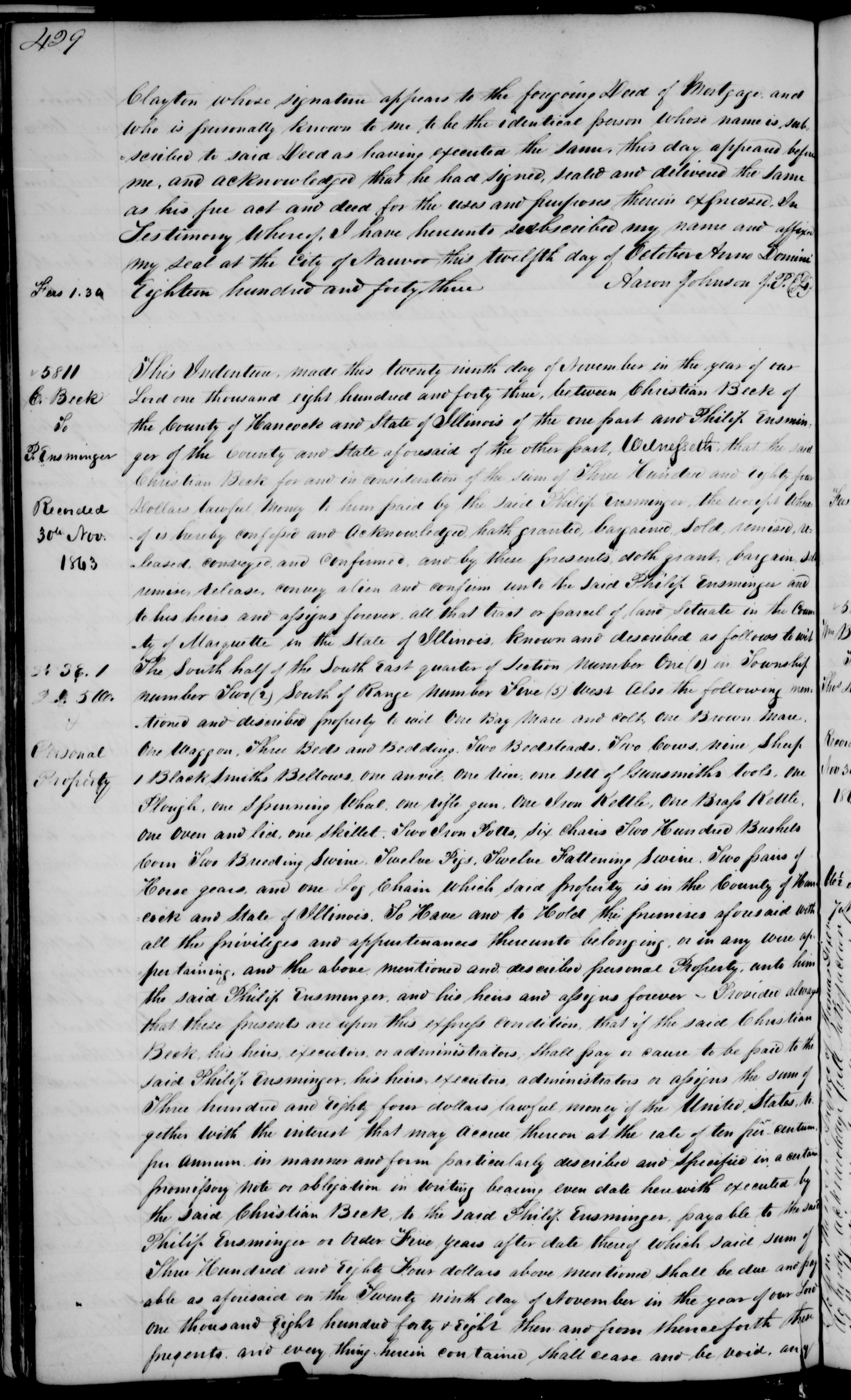 , Mortgage for property in , IL, to Hugh Rhodes, 12 Oct. 1843. Version copied 29 Nov. 1843 in Hancock County, IL, Bonds and Mortgages, vol. 1, pp. 427–429; unidentified handwriting; Hancock County Courthouse, Carthage, IL; microfilm at FHL.