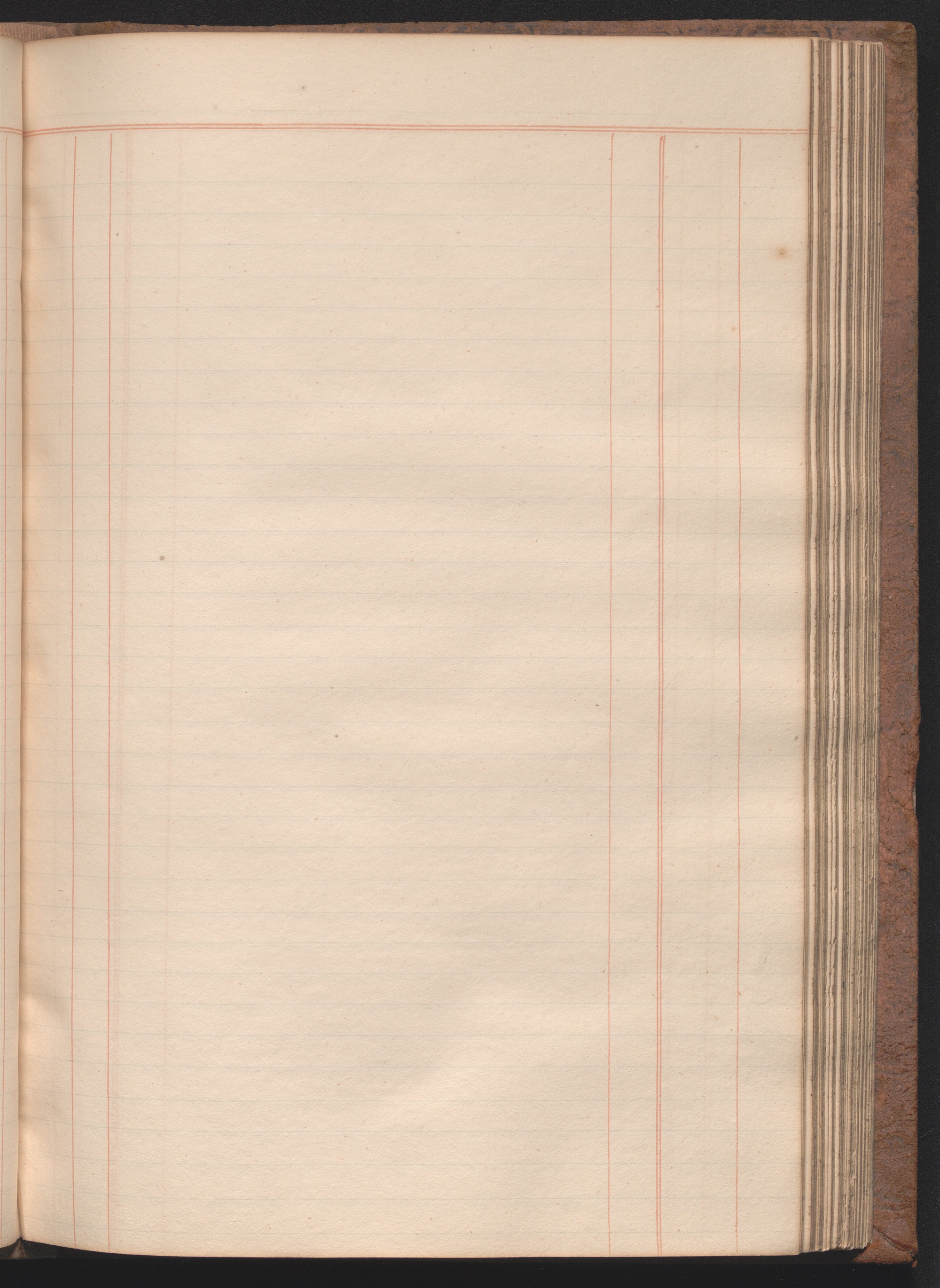 The first inscription in the book is the headers “Woods” and “Cr.” above two columns on the first extant ruled page following the tabbed index pages, suggesting that the book was originally intended to be an account book. This use was aborted, as evidenced by the removal of the second front flyleaf—which may have contained a title page—as well as the final “XYZ” tabbed index page and the additional ten leaves that would have been paginated 1 through 20. Additionally, none of the extant index pages include any inscription.