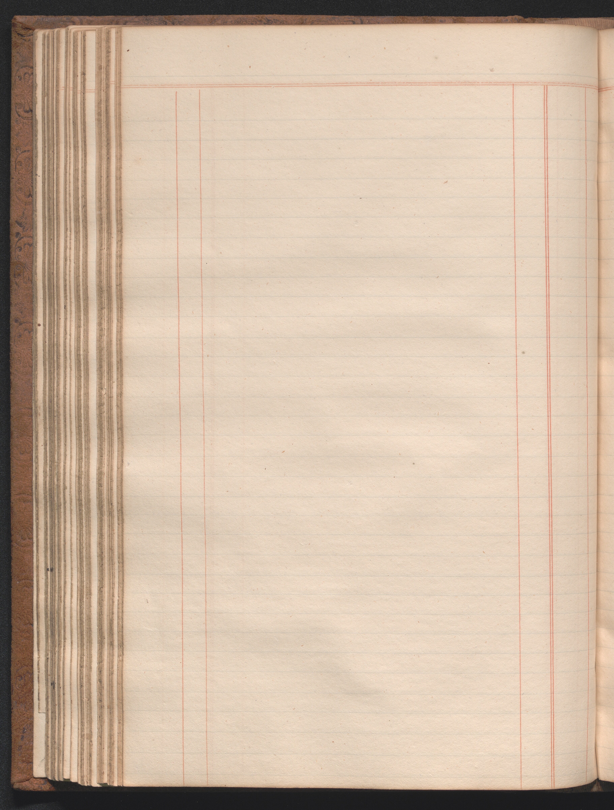 Medium-size ledger book measuring 12¾ × 8½ × 1½ inches (32 × 22 × 4 cm). The paper measures 12⅜ × 7¾ inches (31 × 20 cm) and is ruled horizontally with one blue double line and thirty-four single blue lines and vertically with four single red lines and one red double line, demarcating columns. The book contains 180 extant leaves, including one unruled front flyleaf and two unruled back flyleaves. The first eleven ruled leaves compose a tabbed index. The final tabbed leaf was later torn out, along with an unknown number of additional leaves, presumably ten, as the first extant ruled leaf is hand paginated 21. The second front flyleaf was also torn out of the volume. The gatherings were sewn all along. Shell marbled papers, with a blue and black body and red veins, are glued to the inside covers of the boards and to the exterior page of each endpaper. The text block is bound in ledger style to the boards. The boards and spine are covered in brown suede. The front and rear boards are embossed along the edges with vegetal designs. The spine was constructed with four false raised bands demarcating five panels. The second panel, which was painted red, has the word “LEDGER” stamped in gold leaf. The two bands and two panels below the red panel were painted black. Paper labels are glued to the third and fifth panels. The label on the third panel has a handwritten title: “Nauvoo | Legion Min. | 1841–4.” in black ink on lined white paper. There is an archival label glued to the fifth panel that was apparently added later and includes an identification number handwritten in black ink. There is also an archival label affixed to the marbled pastedown on the inside of the front board with archival markings in ink and in graphite.