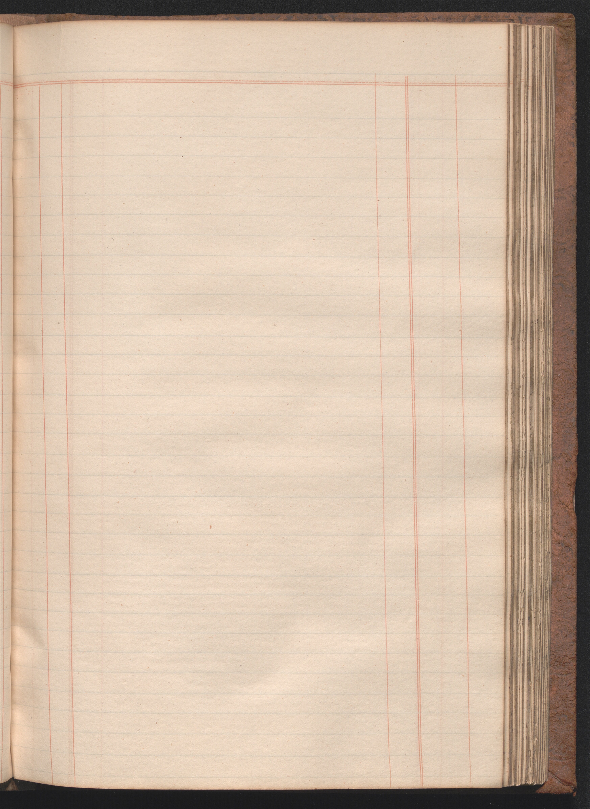 The first inscription in the book is the headers “Woods” and “Cr.” above two columns on the first extant ruled page following the tabbed index pages, suggesting that the book was originally intended to be an account book. This use was aborted, as evidenced by the removal of the second front flyleaf—which may have contained a title page—as well as the final “XYZ” tabbed index page and the additional ten leaves that would have been paginated 1 through 20. Additionally, none of the extant index pages include any inscription.