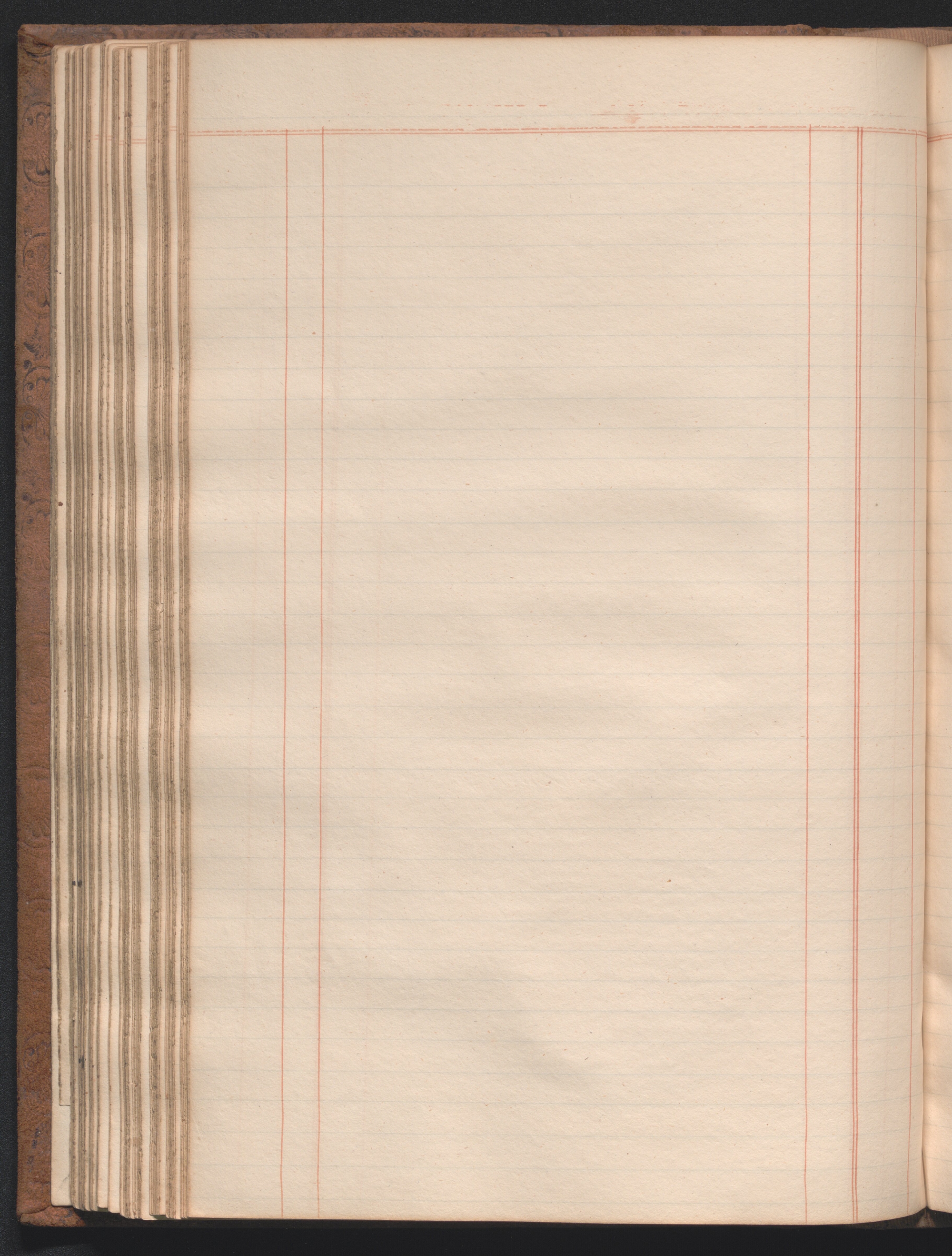 Medium-size ledger book measuring 12¾ × 8½ × 1½ inches (32 × 22 × 4 cm). The paper measures 12⅜ × 7¾ inches (31 × 20 cm) and is ruled horizontally with one blue double line and thirty-four single blue lines and vertically with four single red lines and one red double line, demarcating columns. The book contains 180 extant leaves, including one unruled front flyleaf and two unruled back flyleaves. The first eleven ruled leaves compose a tabbed index. The final tabbed leaf was later torn out, along with an unknown number of additional leaves, presumably ten, as the first extant ruled leaf is hand paginated 21. The second front flyleaf was also torn out of the volume. The gatherings were sewn all along. Shell marbled papers, with a blue and black body and red veins, are glued to the inside covers of the boards and to the exterior page of each endpaper. The text block is bound in ledger style to the boards. The boards and spine are covered in brown suede. The front and rear boards are embossed along the edges with vegetal designs. The spine was constructed with four false raised bands demarcating five panels. The second panel, which was painted red, has the word “LEDGER” stamped in gold leaf. The two bands and two panels below the red panel were painted black. Paper labels are glued to the third and fifth panels. The label on the third panel has a handwritten title: “Nauvoo | Legion Min. | 1841–4.” in black ink on lined white paper. There is an archival label glued to the fifth panel that was apparently added later and includes an identification number handwritten in black ink. There is also an archival label affixed to the marbled pastedown on the inside of the front board with archival markings in ink and in graphite.
