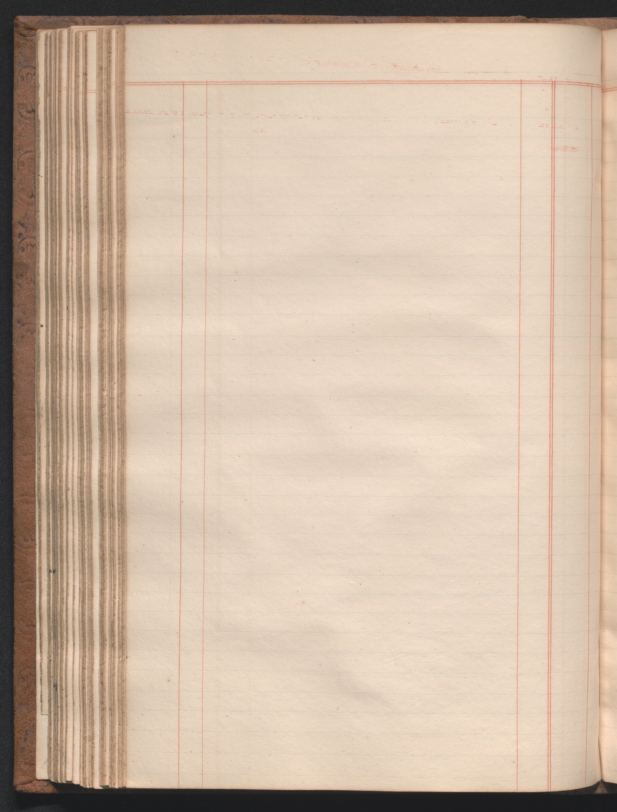 Medium-size ledger book measuring 12¾ × 8½ × 1½ inches (32 × 22 × 4 cm). The paper measures 12⅜ × 7¾ inches (31 × 20 cm) and is ruled horizontally with one blue double line and thirty-four single blue lines and vertically with four single red lines and one red double line, demarcating columns. The book contains 180 extant leaves, including one unruled front flyleaf and two unruled back flyleaves. The first eleven ruled leaves compose a tabbed index. The final tabbed leaf was later torn out, along with an unknown number of additional leaves, presumably ten, as the first extant ruled leaf is hand paginated 21. The second front flyleaf was also torn out of the volume. The gatherings were sewn all along. Shell marbled papers, with a blue and black body and red veins, are glued to the inside covers of the boards and to the exterior page of each endpaper. The text block is bound in ledger style to the boards. The boards and spine are covered in brown suede. The front and rear boards are embossed along the edges with vegetal designs. The spine was constructed with four false raised bands demarcating five panels. The second panel, which was painted red, has the word “LEDGER” stamped in gold leaf. The two bands and two panels below the red panel were painted black. Paper labels are glued to the third and fifth panels. The label on the third panel has a handwritten title: “Nauvoo | Legion Min. | 1841–4.” in black ink on lined white paper. There is an archival label glued to the fifth panel that was apparently added later and includes an identification number handwritten in black ink. There is also an archival label affixed to the marbled pastedown on the inside of the front board with archival markings in ink and in graphite.
