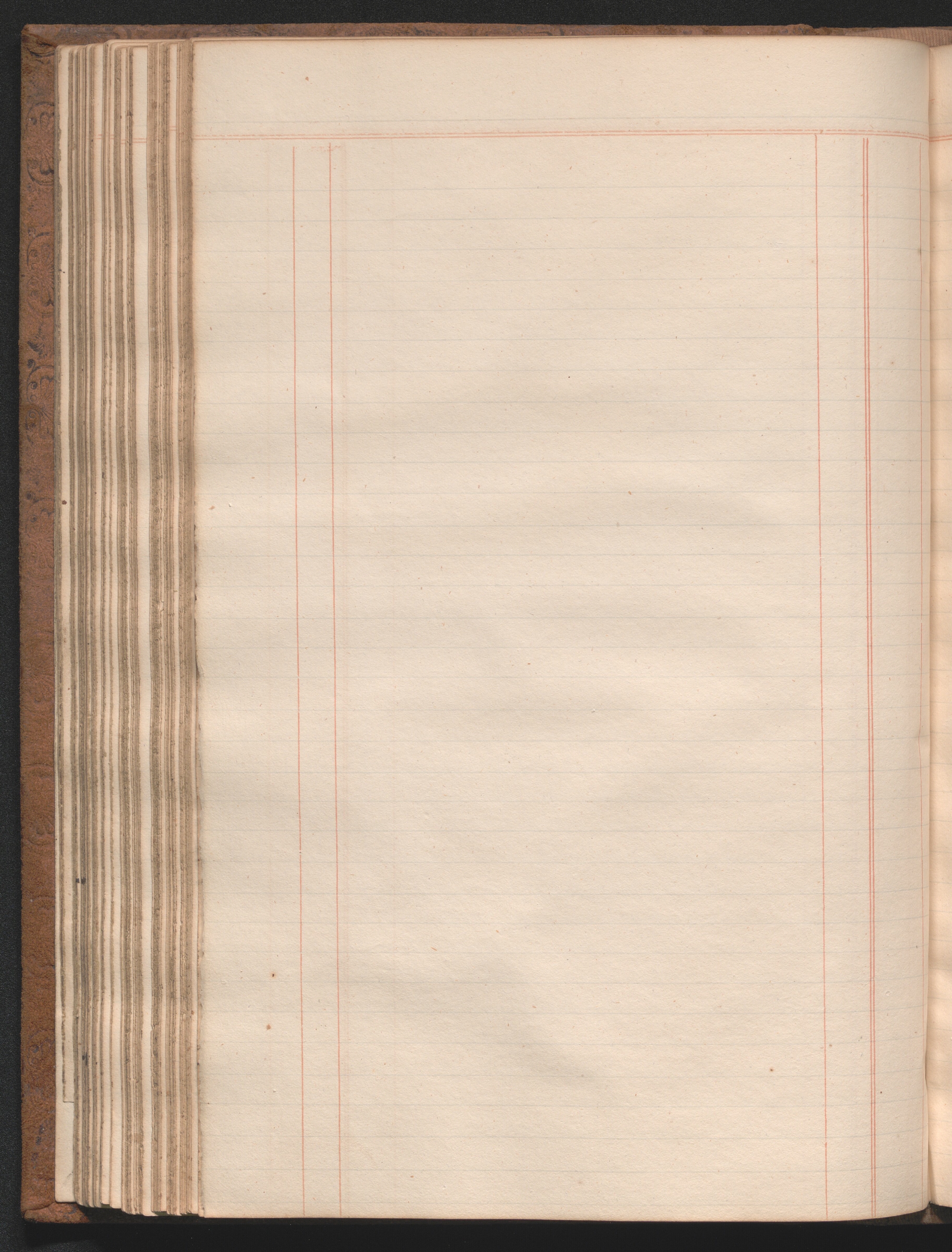 Medium-size ledger book measuring 12¾ × 8½ × 1½ inches (32 × 22 × 4 cm). The paper measures 12⅜ × 7¾ inches (31 × 20 cm) and is ruled horizontally with one blue double line and thirty-four single blue lines and vertically with four single red lines and one red double line, demarcating columns. The book contains 180 extant leaves, including one unruled front flyleaf and two unruled back flyleaves. The first eleven ruled leaves compose a tabbed index. The final tabbed leaf was later torn out, along with an unknown number of additional leaves, presumably ten, as the first extant ruled leaf is hand paginated 21. The second front flyleaf was also torn out of the volume. The gatherings were sewn all along. Shell marbled papers, with a blue and black body and red veins, are glued to the inside covers of the boards and to the exterior page of each endpaper. The text block is bound in ledger style to the boards. The boards and spine are covered in brown suede. The front and rear boards are embossed along the edges with vegetal designs. The spine was constructed with four false raised bands demarcating five panels. The second panel, which was painted red, has the word “LEDGER” stamped in gold leaf. The two bands and two panels below the red panel were painted black. Paper labels are glued to the third and fifth panels. The label on the third panel has a handwritten title: “Nauvoo | Legion Min. | 1841–4.” in black ink on lined white paper. There is an archival label glued to the fifth panel that was apparently added later and includes an identification number handwritten in black ink. There is also an archival label affixed to the marbled pastedown on the inside of the front board with archival markings in ink and in graphite.