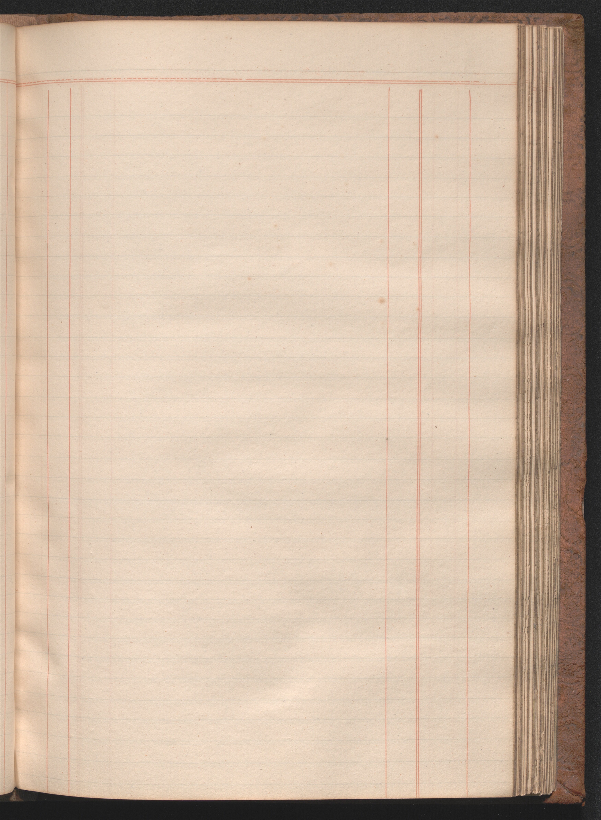 The first inscription in the book is the headers “Woods” and “Cr.” above two columns on the first extant ruled page following the tabbed index pages, suggesting that the book was originally intended to be an account book. This use was aborted, as evidenced by the removal of the second front flyleaf—which may have contained a title page—as well as the final “XYZ” tabbed index page and the additional ten leaves that would have been paginated 1 through 20. Additionally, none of the extant index pages include any inscription.