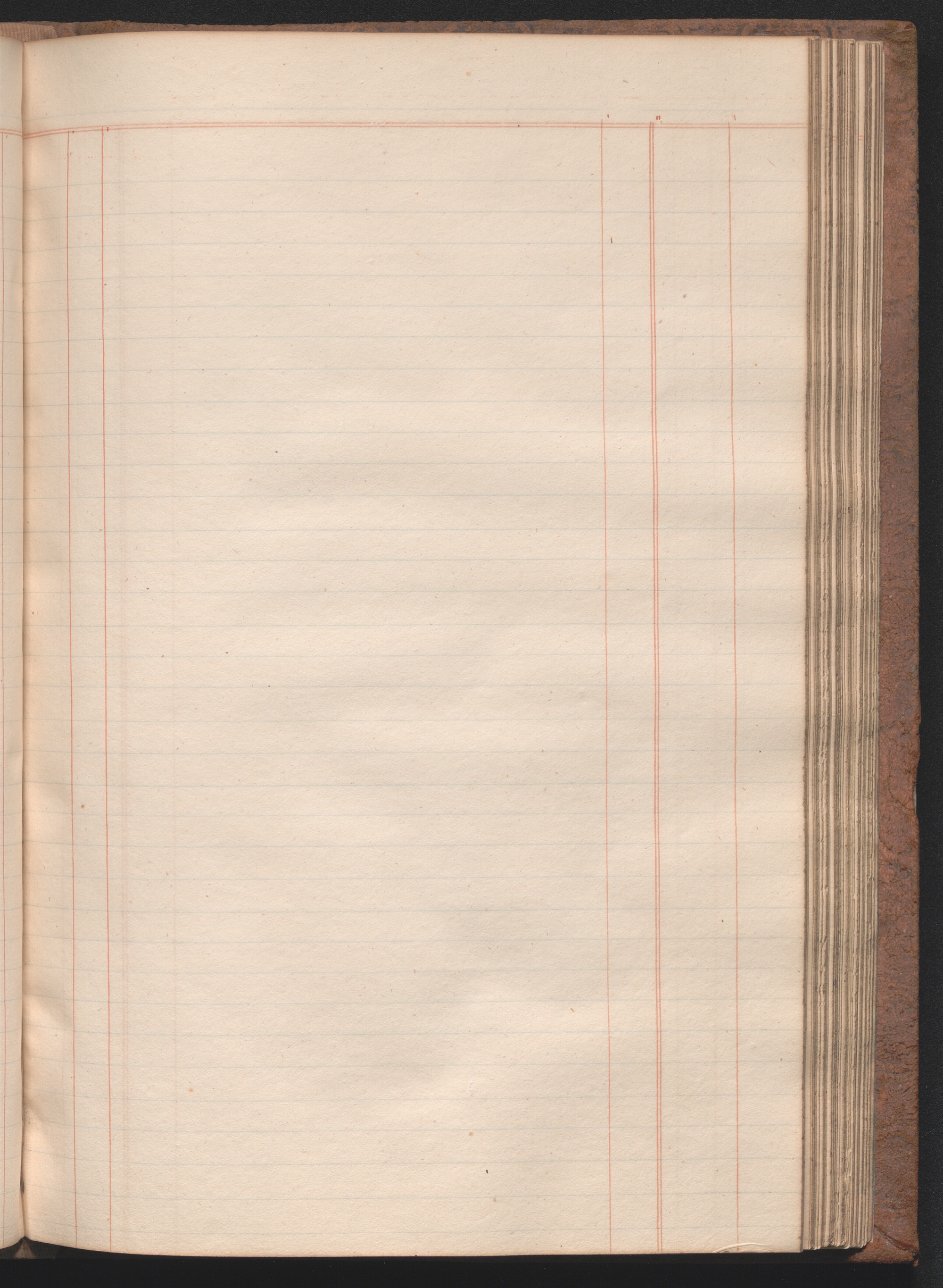Medium-size ledger book measuring 12¾ × 8½ × 1½ inches (32 × 22 × 4 cm). The paper measures 12⅜ × 7¾ inches (31 × 20 cm) and is ruled horizontally with one blue double line and thirty-four single blue lines and vertically with four single red lines and one red double line, demarcating columns. The book contains 180 extant leaves, including one unruled front flyleaf and two unruled back flyleaves. The first eleven ruled leaves compose a tabbed index. The final tabbed leaf was later torn out, along with an unknown number of additional leaves, presumably ten, as the first extant ruled leaf is hand paginated 21. The second front flyleaf was also torn out of the volume. The gatherings were sewn all along. Shell marbled papers, with a blue and black body and red veins, are glued to the inside covers of the boards and to the exterior page of each endpaper. The text block is bound in ledger style to the boards. The boards and spine are covered in brown suede. The front and rear boards are embossed along the edges with vegetal designs. The spine was constructed with four false raised bands demarcating five panels. The second panel, which was painted red, has the word “LEDGER” stamped in gold leaf. The two bands and two panels below the red panel were painted black. Paper labels are glued to the third and fifth panels. The label on the third panel has a handwritten title: “Nauvoo | Legion Min. | 1841–4.” in black ink on lined white paper. There is an archival label glued to the fifth panel that was apparently added later and includes an identification number handwritten in black ink. There is also an archival label affixed to the marbled pastedown on the inside of the front board with archival markings in ink and in graphite.