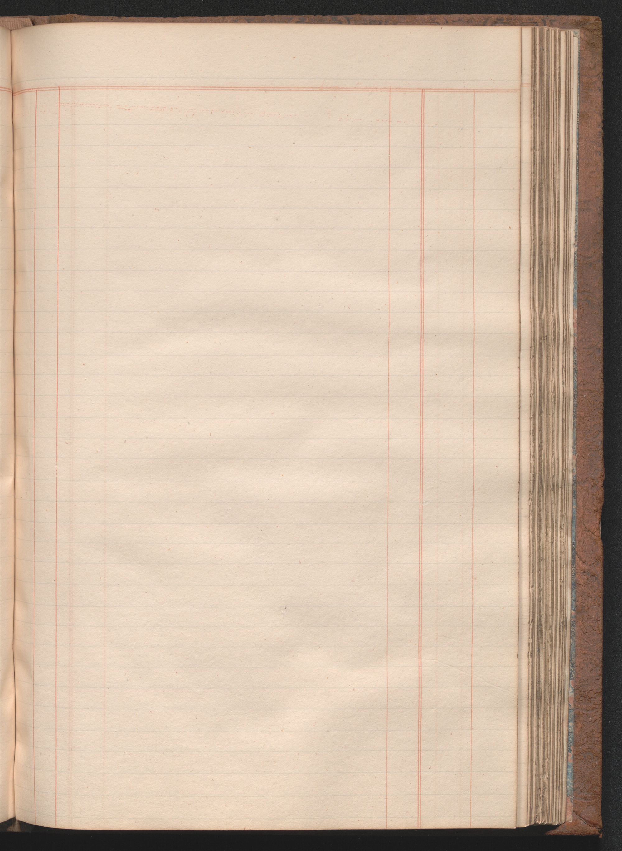 Medium-size ledger book measuring 12¾ × 8½ × 1½ inches (32 × 22 × 4 cm). The paper measures 12⅜ × 7¾ inches (31 × 20 cm) and is ruled horizontally with one blue double line and thirty-four single blue lines and vertically with four single red lines and one red double line, demarcating columns. The book contains 180 extant leaves, including one unruled front flyleaf and two unruled back flyleaves. The first eleven ruled leaves compose a tabbed index. The final tabbed leaf was later torn out, along with an unknown number of additional leaves, presumably ten, as the first extant ruled leaf is hand paginated 21. The second front flyleaf was also torn out of the volume. The gatherings were sewn all along. Shell marbled papers, with a blue and black body and red veins, are glued to the inside covers of the boards and to the exterior page of each endpaper. The text block is bound in ledger style to the boards. The boards and spine are covered in brown suede. The front and rear boards are embossed along the edges with vegetal designs. The spine was constructed with four false raised bands demarcating five panels. The second panel, which was painted red, has the word “LEDGER” stamped in gold leaf. The two bands and two panels below the red panel were painted black. Paper labels are glued to the third and fifth panels. The label on the third panel has a handwritten title: “Nauvoo | Legion Min. | 1841–4.” in black ink on lined white paper. There is an archival label glued to the fifth panel that was apparently added later and includes an identification number handwritten in black ink. There is also an archival label affixed to the marbled pastedown on the inside of the front board with archival markings in ink and in graphite.