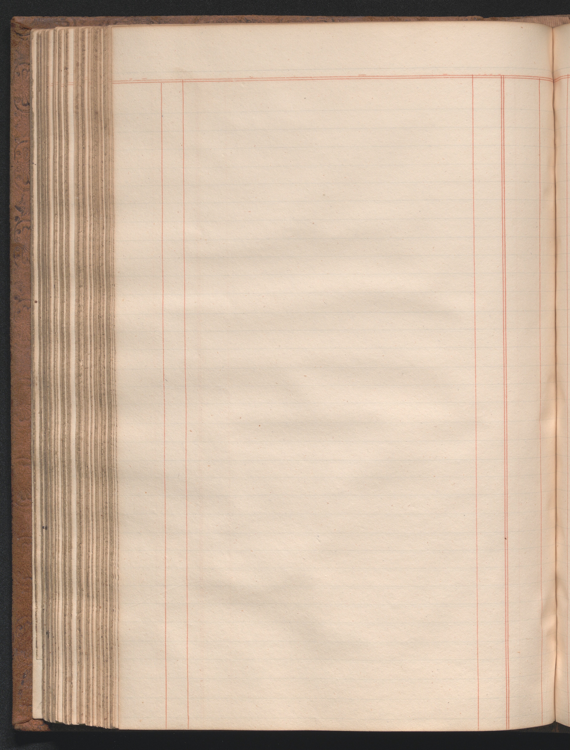 Medium-size ledger book measuring 12¾ × 8½ × 1½ inches (32 × 22 × 4 cm). The paper measures 12⅜ × 7¾ inches (31 × 20 cm) and is ruled horizontally with one blue double line and thirty-four single blue lines and vertically with four single red lines and one red double line, demarcating columns. The book contains 180 extant leaves, including one unruled front flyleaf and two unruled back flyleaves. The first eleven ruled leaves compose a tabbed index. The final tabbed leaf was later torn out, along with an unknown number of additional leaves, presumably ten, as the first extant ruled leaf is hand paginated 21. The second front flyleaf was also torn out of the volume. The gatherings were sewn all along. Shell marbled papers, with a blue and black body and red veins, are glued to the inside covers of the boards and to the exterior page of each endpaper. The text block is bound in ledger style to the boards. The boards and spine are covered in brown suede. The front and rear boards are embossed along the edges with vegetal designs. The spine was constructed with four false raised bands demarcating five panels. The second panel, which was painted red, has the word “LEDGER” stamped in gold leaf. The two bands and two panels below the red panel were painted black. Paper labels are glued to the third and fifth panels. The label on the third panel has a handwritten title: “Nauvoo | Legion Min. | 1841–4.” in black ink on lined white paper. There is an archival label glued to the fifth panel that was apparently added later and includes an identification number handwritten in black ink. There is also an archival label affixed to the marbled pastedown on the inside of the front board with archival markings in ink and in graphite.