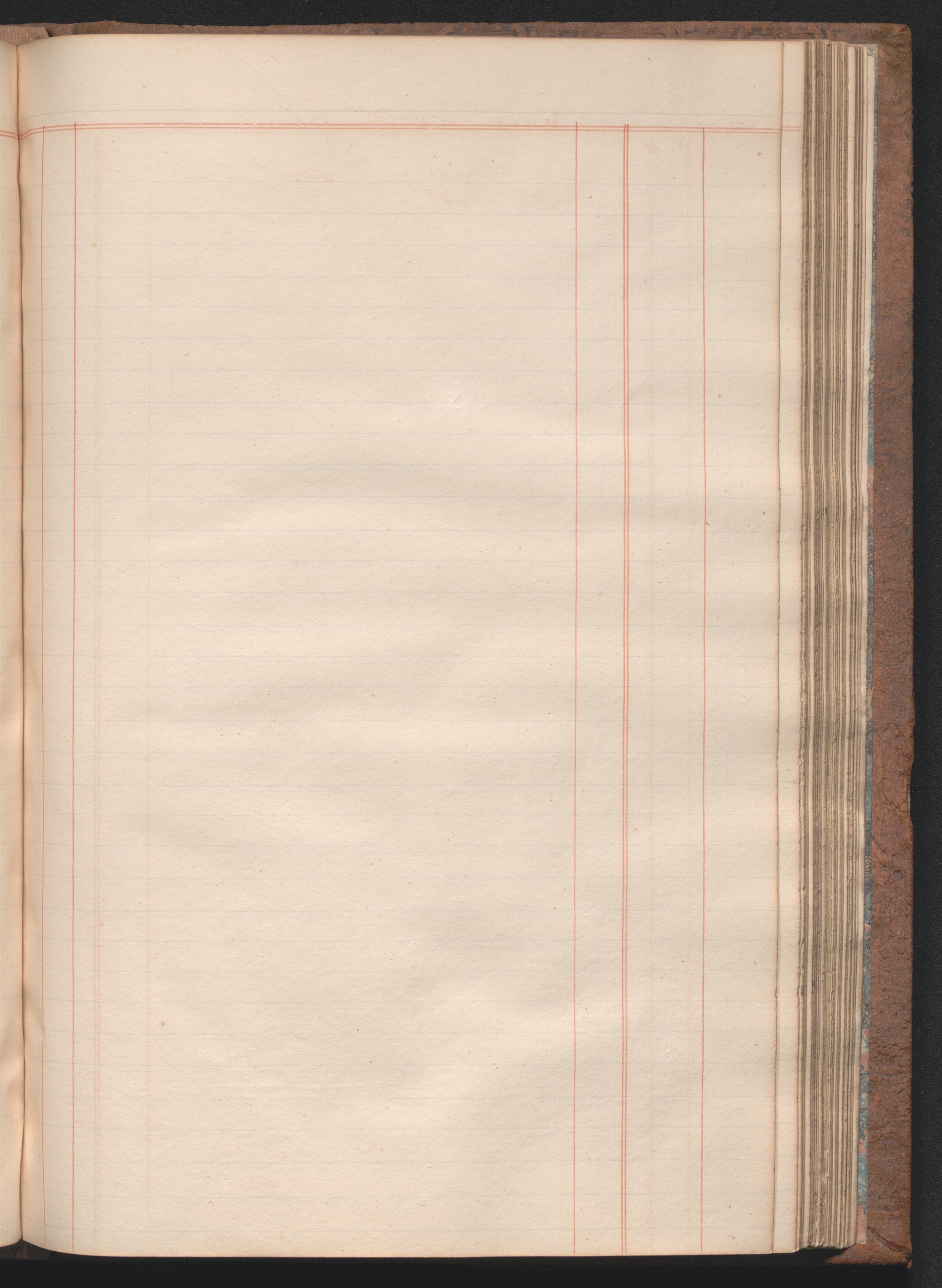 Medium-size ledger book measuring 12¾ × 8½ × 1½ inches (32 × 22 × 4 cm). The paper measures 12⅜ × 7¾ inches (31 × 20 cm) and is ruled horizontally with one blue double line and thirty-four single blue lines and vertically with four single red lines and one red double line, demarcating columns. The book contains 180 extant leaves, including one unruled front flyleaf and two unruled back flyleaves. The first eleven ruled leaves compose a tabbed index. The final tabbed leaf was later torn out, along with an unknown number of additional leaves, presumably ten, as the first extant ruled leaf is hand paginated 21. The second front flyleaf was also torn out of the volume. The gatherings were sewn all along. Shell marbled papers, with a blue and black body and red veins, are glued to the inside covers of the boards and to the exterior page of each endpaper. The text block is bound in ledger style to the boards. The boards and spine are covered in brown suede. The front and rear boards are embossed along the edges with vegetal designs. The spine was constructed with four false raised bands demarcating five panels. The second panel, which was painted red, has the word “LEDGER” stamped in gold leaf. The two bands and two panels below the red panel were painted black. Paper labels are glued to the third and fifth panels. The label on the third panel has a handwritten title: “Nauvoo | Legion Min. | 1841–4.” in black ink on lined white paper. There is an archival label glued to the fifth panel that was apparently added later and includes an identification number handwritten in black ink. There is also an archival label affixed to the marbled pastedown on the inside of the front board with archival markings in ink and in graphite.