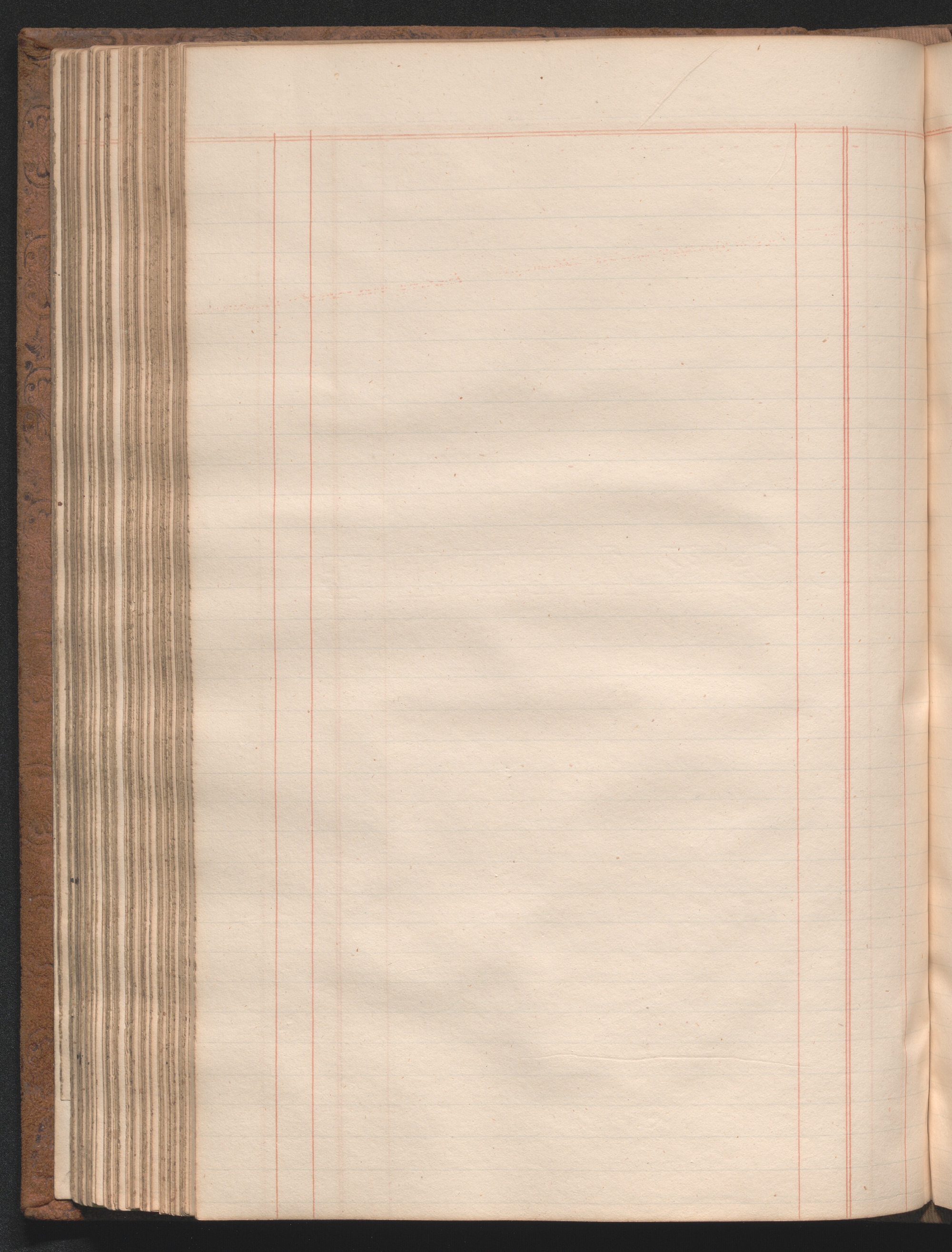 Medium-size ledger book measuring 12¾ × 8½ × 1½ inches (32 × 22 × 4 cm). The paper measures 12⅜ × 7¾ inches (31 × 20 cm) and is ruled horizontally with one blue double line and thirty-four single blue lines and vertically with four single red lines and one red double line, demarcating columns. The book contains 180 extant leaves, including one unruled front flyleaf and two unruled back flyleaves. The first eleven ruled leaves compose a tabbed index. The final tabbed leaf was later torn out, along with an unknown number of additional leaves, presumably ten, as the first extant ruled leaf is hand paginated 21. The second front flyleaf was also torn out of the volume. The gatherings were sewn all along. Shell marbled papers, with a blue and black body and red veins, are glued to the inside covers of the boards and to the exterior page of each endpaper. The text block is bound in ledger style to the boards. The boards and spine are covered in brown suede. The front and rear boards are embossed along the edges with vegetal designs. The spine was constructed with four false raised bands demarcating five panels. The second panel, which was painted red, has the word “LEDGER” stamped in gold leaf. The two bands and two panels below the red panel were painted black. Paper labels are glued to the third and fifth panels. The label on the third panel has a handwritten title: “Nauvoo | Legion Min. | 1841–4.” in black ink on lined white paper. There is an archival label glued to the fifth panel that was apparently added later and includes an identification number handwritten in black ink. There is also an archival label affixed to the marbled pastedown on the inside of the front board with archival markings in ink and in graphite.