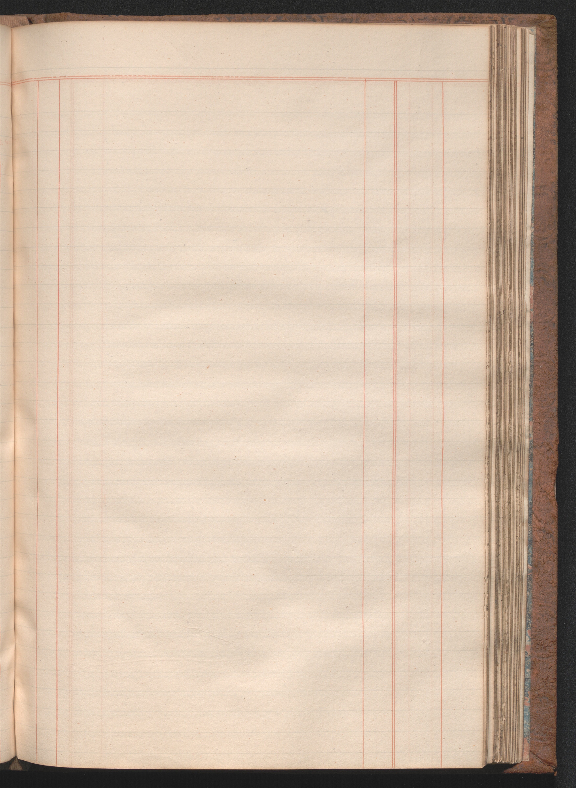The first inscription in the book is the headers “Woods” and “Cr.” above two columns on the first extant ruled page following the tabbed index pages, suggesting that the book was originally intended to be an account book. This use was aborted, as evidenced by the removal of the second front flyleaf—which may have contained a title page—as well as the final “XYZ” tabbed index page and the additional ten leaves that would have been paginated 1 through 20. Additionally, none of the extant index pages include any inscription.