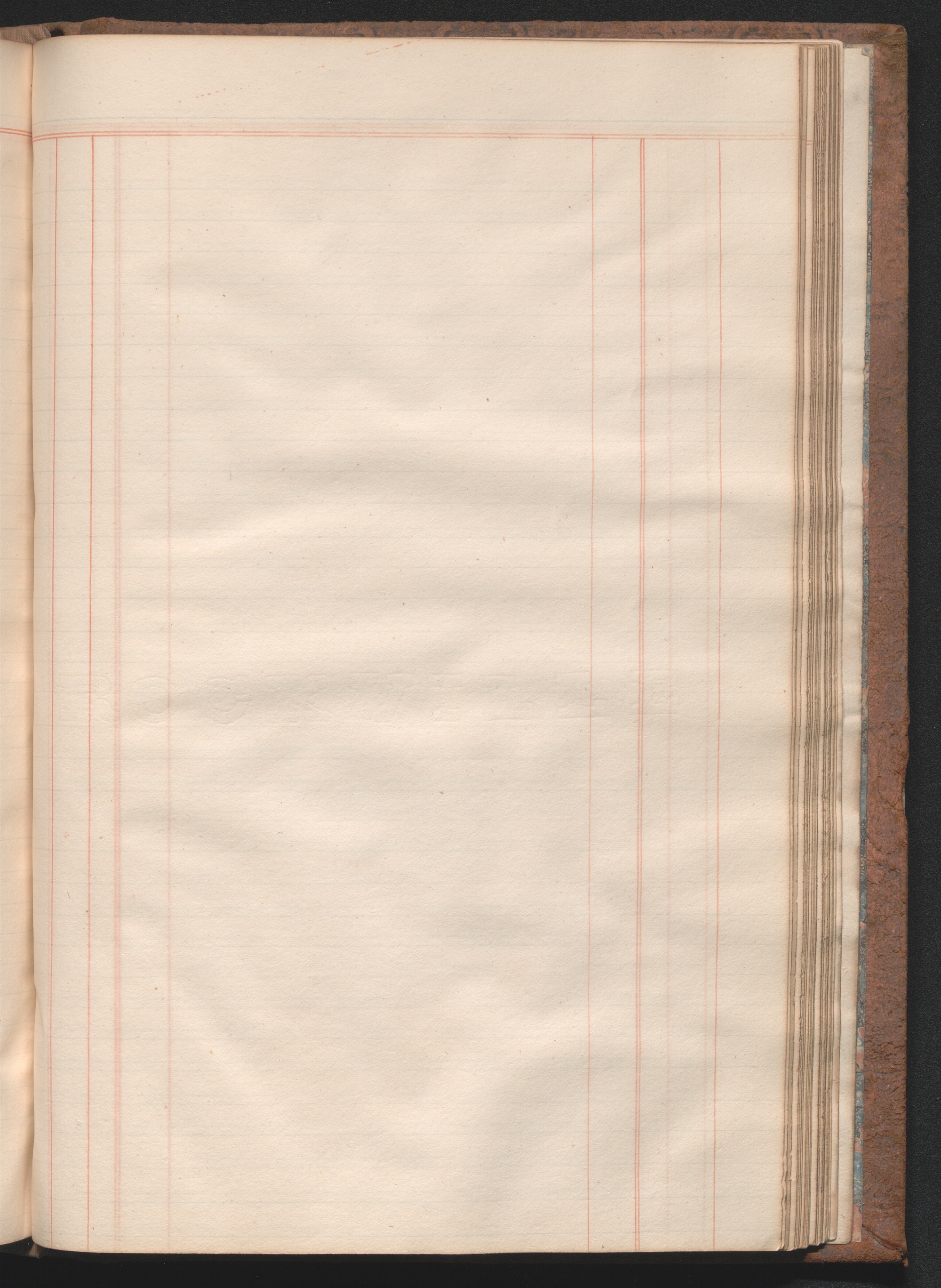 The first inscription in the book is the headers “Woods” and “Cr.” above two columns on the first extant ruled page following the tabbed index pages, suggesting that the book was originally intended to be an account book. This use was aborted, as evidenced by the removal of the second front flyleaf—which may have contained a title page—as well as the final “XYZ” tabbed index page and the additional ten leaves that would have been paginated 1 through 20. Additionally, none of the extant index pages include any inscription.