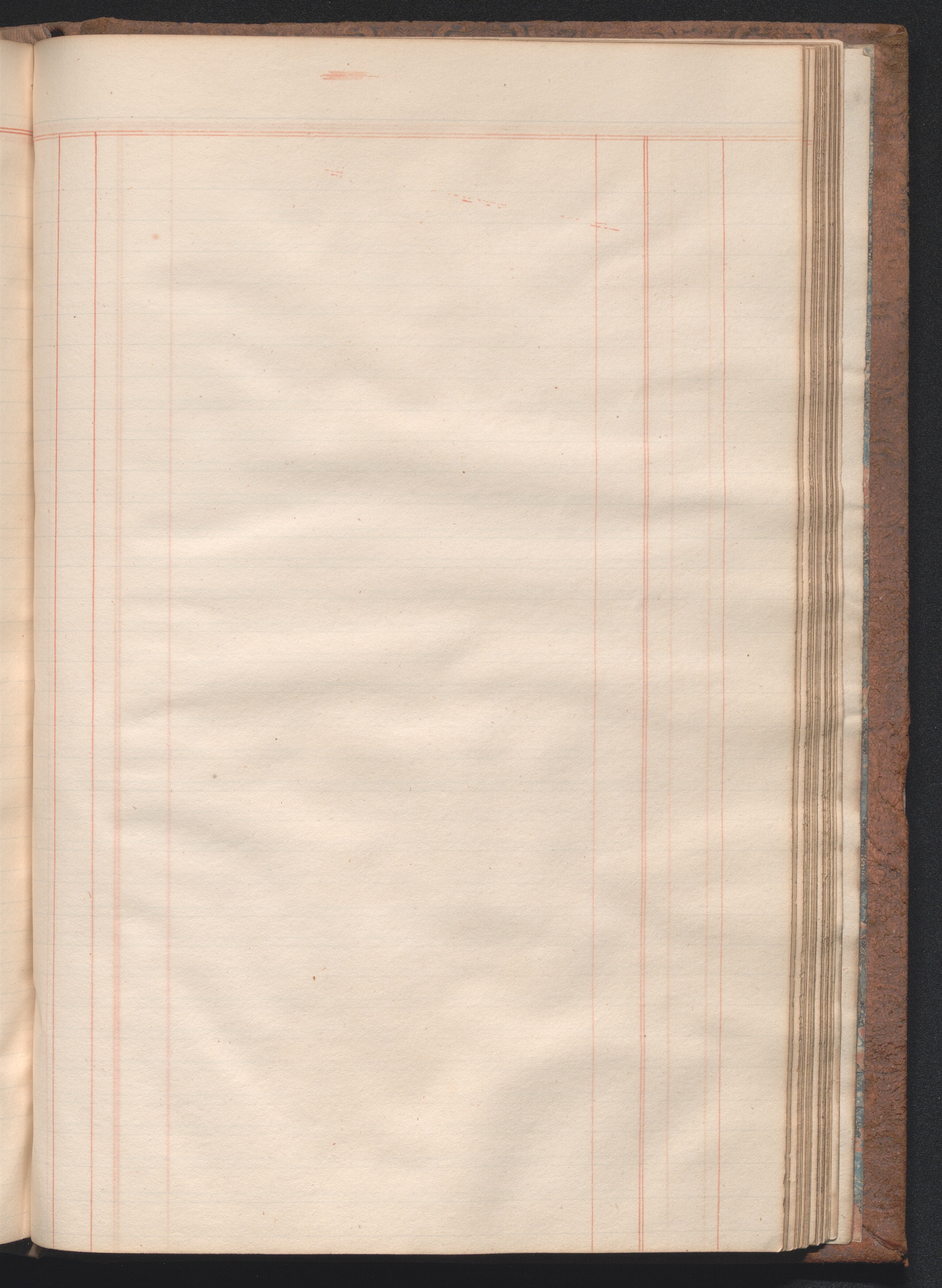 Medium-size ledger book measuring 12¾ × 8½ × 1½ inches (32 × 22 × 4 cm). The paper measures 12⅜ × 7¾ inches (31 × 20 cm) and is ruled horizontally with one blue double line and thirty-four single blue lines and vertically with four single red lines and one red double line, demarcating columns. The book contains 180 extant leaves, including one unruled front flyleaf and two unruled back flyleaves. The first eleven ruled leaves compose a tabbed index. The final tabbed leaf was later torn out, along with an unknown number of additional leaves, presumably ten, as the first extant ruled leaf is hand paginated 21. The second front flyleaf was also torn out of the volume. The gatherings were sewn all along. Shell marbled papers, with a blue and black body and red veins, are glued to the inside covers of the boards and to the exterior page of each endpaper. The text block is bound in ledger style to the boards. The boards and spine are covered in brown suede. The front and rear boards are embossed along the edges with vegetal designs. The spine was constructed with four false raised bands demarcating five panels. The second panel, which was painted red, has the word “LEDGER” stamped in gold leaf. The two bands and two panels below the red panel were painted black. Paper labels are glued to the third and fifth panels. The label on the third panel has a handwritten title: “Nauvoo | Legion Min. | 1841–4.” in black ink on lined white paper. There is an archival label glued to the fifth panel that was apparently added later and includes an identification number handwritten in black ink. There is also an archival label affixed to the marbled pastedown on the inside of the front board with archival markings in ink and in graphite.