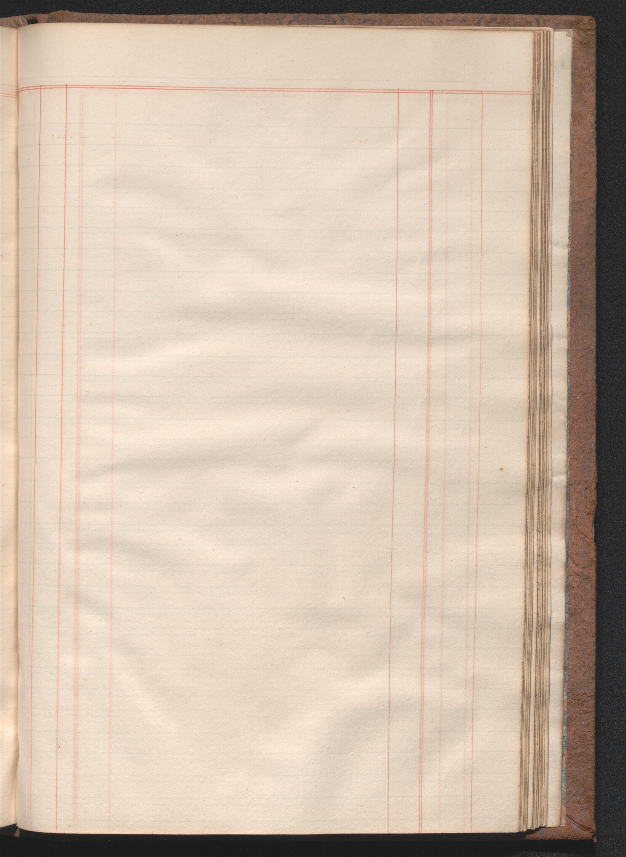 Medium-size ledger book measuring 12¾ × 8½ × 1½ inches (32 × 22 × 4 cm). The paper measures 12⅜ × 7¾ inches (31 × 20 cm) and is ruled horizontally with one blue double line and thirty-four single blue lines and vertically with four single red lines and one red double line, demarcating columns. The book contains 180 extant leaves, including one unruled front flyleaf and two unruled back flyleaves. The first eleven ruled leaves compose a tabbed index. The final tabbed leaf was later torn out, along with an unknown number of additional leaves, presumably ten, as the first extant ruled leaf is hand paginated 21. The second front flyleaf was also torn out of the volume. The gatherings were sewn all along. Shell marbled papers, with a blue and black body and red veins, are glued to the inside covers of the boards and to the exterior page of each endpaper. The text block is bound in ledger style to the boards. The boards and spine are covered in brown suede. The front and rear boards are embossed along the edges with vegetal designs. The spine was constructed with four false raised bands demarcating five panels. The second panel, which was painted red, has the word “LEDGER” stamped in gold leaf. The two bands and two panels below the red panel were painted black. Paper labels are glued to the third and fifth panels. The label on the third panel has a handwritten title: “Nauvoo | Legion Min. | 1841–4.” in black ink on lined white paper. There is an archival label glued to the fifth panel that was apparently added later and includes an identification number handwritten in black ink. There is also an archival label affixed to the marbled pastedown on the inside of the front board with archival markings in ink and in graphite.