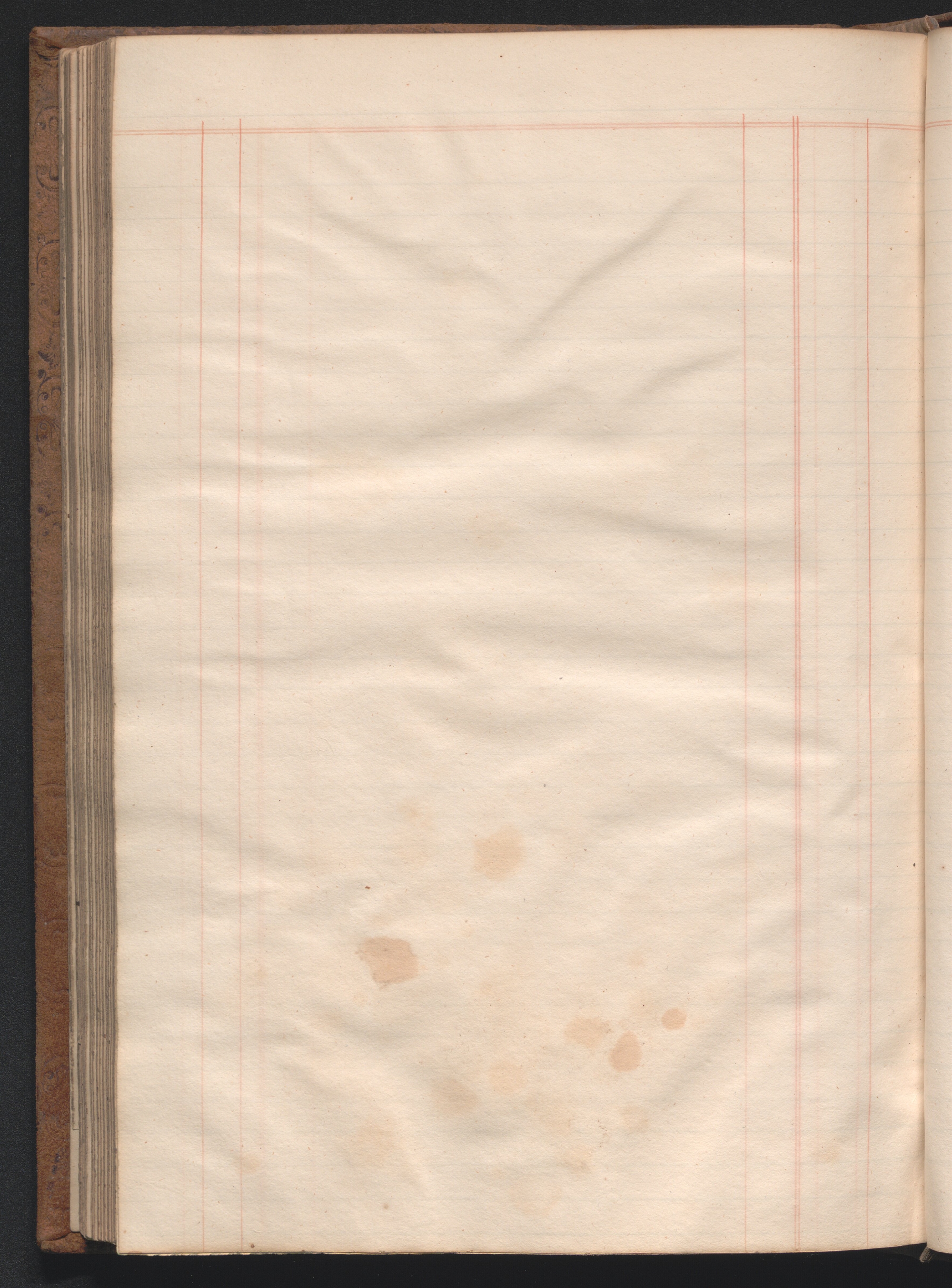 Medium-size ledger book measuring 12¾ × 8½ × 1½ inches (32 × 22 × 4 cm). The paper measures 12⅜ × 7¾ inches (31 × 20 cm) and is ruled horizontally with one blue double line and thirty-four single blue lines and vertically with four single red lines and one red double line, demarcating columns. The book contains 180 extant leaves, including one unruled front flyleaf and two unruled back flyleaves. The first eleven ruled leaves compose a tabbed index. The final tabbed leaf was later torn out, along with an unknown number of additional leaves, presumably ten, as the first extant ruled leaf is hand paginated 21. The second front flyleaf was also torn out of the volume. The gatherings were sewn all along. Shell marbled papers, with a blue and black body and red veins, are glued to the inside covers of the boards and to the exterior page of each endpaper. The text block is bound in ledger style to the boards. The boards and spine are covered in brown suede. The front and rear boards are embossed along the edges with vegetal designs. The spine was constructed with four false raised bands demarcating five panels. The second panel, which was painted red, has the word “LEDGER” stamped in gold leaf. The two bands and two panels below the red panel were painted black. Paper labels are glued to the third and fifth panels. The label on the third panel has a handwritten title: “Nauvoo | Legion Min. | 1841–4.” in black ink on lined white paper. There is an archival label glued to the fifth panel that was apparently added later and includes an identification number handwritten in black ink. There is also an archival label affixed to the marbled pastedown on the inside of the front board with archival markings in ink and in graphite.