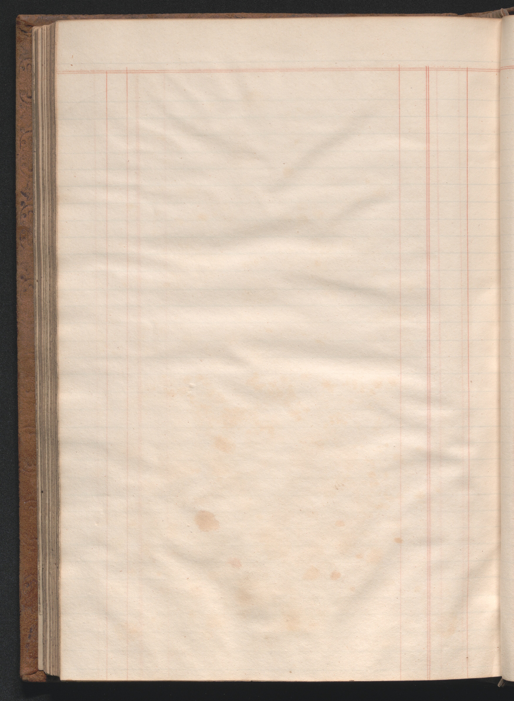 Medium-size ledger book measuring 12¾ × 8½ × 1½ inches (32 × 22 × 4 cm). The paper measures 12⅜ × 7¾ inches (31 × 20 cm) and is ruled horizontally with one blue double line and thirty-four single blue lines and vertically with four single red lines and one red double line, demarcating columns. The book contains 180 extant leaves, including one unruled front flyleaf and two unruled back flyleaves. The first eleven ruled leaves compose a tabbed index. The final tabbed leaf was later torn out, along with an unknown number of additional leaves, presumably ten, as the first extant ruled leaf is hand paginated 21. The second front flyleaf was also torn out of the volume. The gatherings were sewn all along. Shell marbled papers, with a blue and black body and red veins, are glued to the inside covers of the boards and to the exterior page of each endpaper. The text block is bound in ledger style to the boards. The boards and spine are covered in brown suede. The front and rear boards are embossed along the edges with vegetal designs. The spine was constructed with four false raised bands demarcating five panels. The second panel, which was painted red, has the word “LEDGER” stamped in gold leaf. The two bands and two panels below the red panel were painted black. Paper labels are glued to the third and fifth panels. The label on the third panel has a handwritten title: “Nauvoo | Legion Min. | 1841–4.” in black ink on lined white paper. There is an archival label glued to the fifth panel that was apparently added later and includes an identification number handwritten in black ink. There is also an archival label affixed to the marbled pastedown on the inside of the front board with archival markings in ink and in graphite.