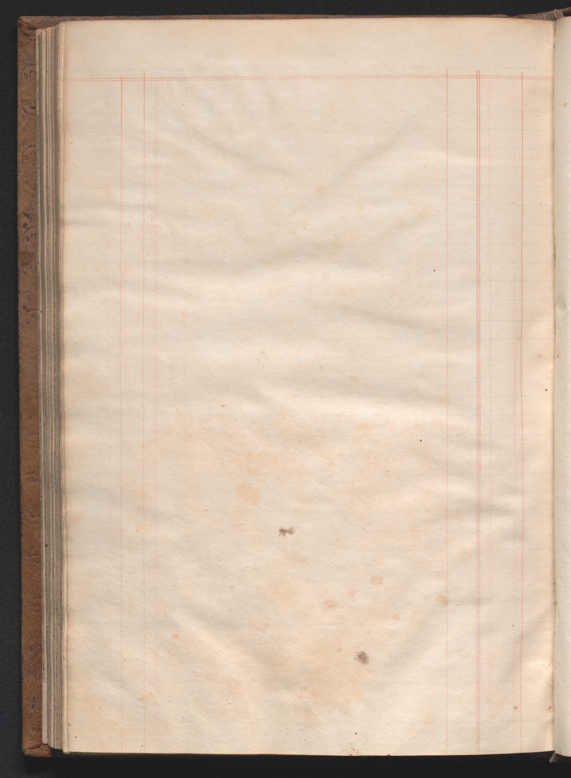 The first inscription in the book is the headers “Woods” and “Cr.” above two columns on the first extant ruled page following the tabbed index pages, suggesting that the book was originally intended to be an account book. This use was aborted, as evidenced by the removal of the second front flyleaf—which may have contained a title page—as well as the final “XYZ” tabbed index page and the additional ten leaves that would have been paginated 1 through 20. Additionally, none of the extant index pages include any inscription.