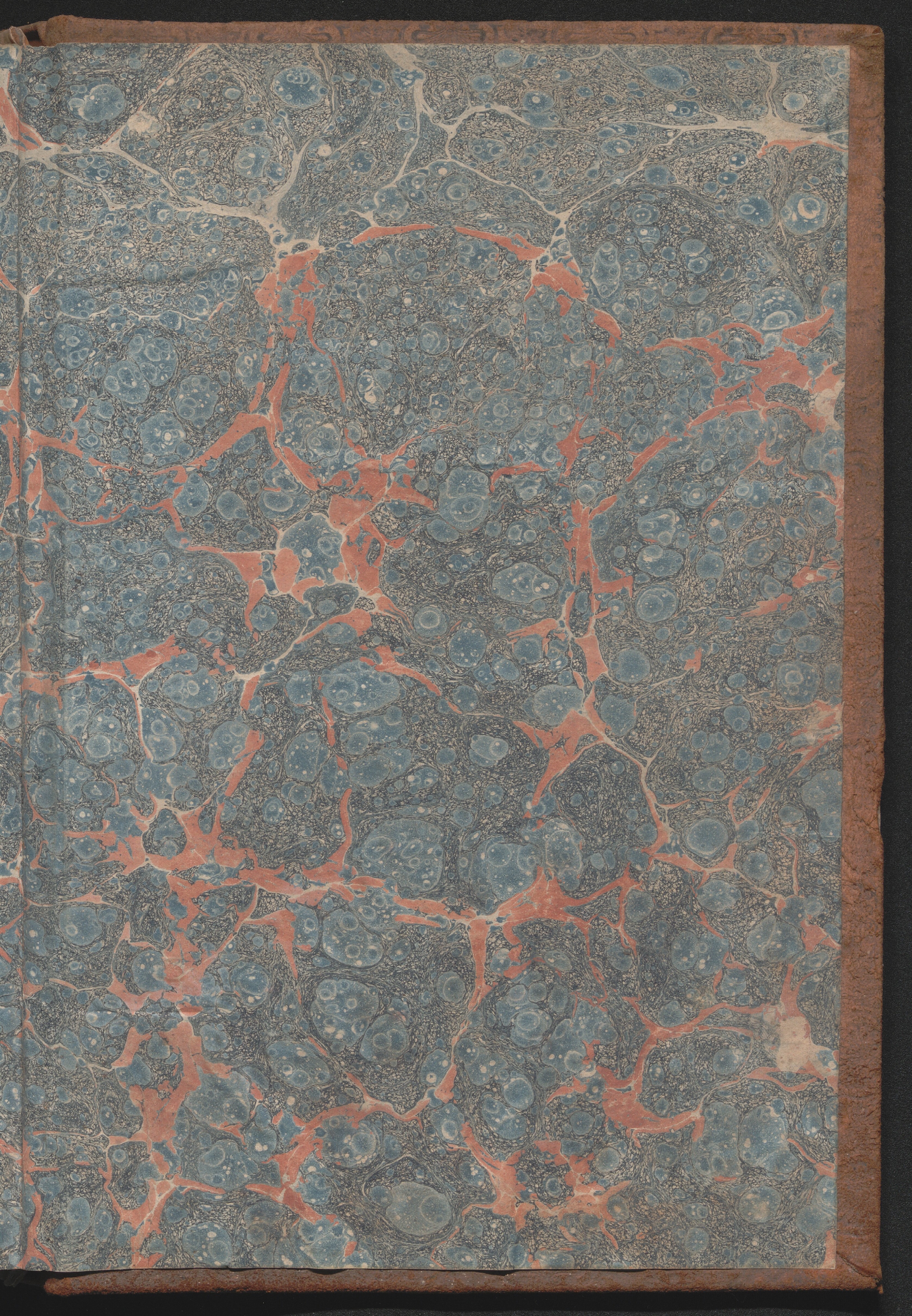 Medium-size ledger book measuring 12¾ × 8½ × 1½ inches (32 × 22 × 4 cm). The paper measures 12⅜ × 7¾ inches (31 × 20 cm) and is ruled horizontally with one blue double line and thirty-four single blue lines and vertically with four single red lines and one red double line, demarcating columns. The book contains 180 extant leaves, including one unruled front flyleaf and two unruled back flyleaves. The first eleven ruled leaves compose a tabbed index. The final tabbed leaf was later torn out, along with an unknown number of additional leaves, presumably ten, as the first extant ruled leaf is hand paginated 21. The second front flyleaf was also torn out of the volume. The gatherings were sewn all along. Shell marbled papers, with a blue and black body and red veins, are glued to the inside covers of the boards and to the exterior page of each endpaper. The text block is bound in ledger style to the boards. The boards and spine are covered in brown suede. The front and rear boards are embossed along the edges with vegetal designs. The spine was constructed with four false raised bands demarcating five panels. The second panel, which was painted red, has the word “LEDGER” stamped in gold leaf. The two bands and two panels below the red panel were painted black. Paper labels are glued to the third and fifth panels. The label on the third panel has a handwritten title: “Nauvoo | Legion Min. | 1841–4.” in black ink on lined white paper. There is an archival label glued to the fifth panel that was apparently added later and includes an identification number handwritten in black ink. There is also an archival label affixed to the marbled pastedown on the inside of the front board with archival markings in ink and in graphite.