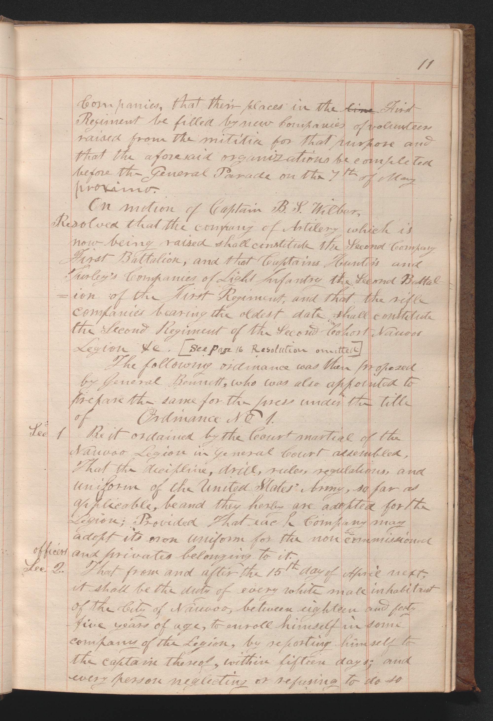 Sec 1 Be it ordained by the Court martial of the Nauvoo Legion in General Court assembled, That the dicipline, drill, rules, regulations, and uniform of the United States’ Army, so far as applicable, be and they herby are adopted for the Legion; Provided That each Company may adopt its own uniform for the non commissioned <officers> and privates belonging to it.