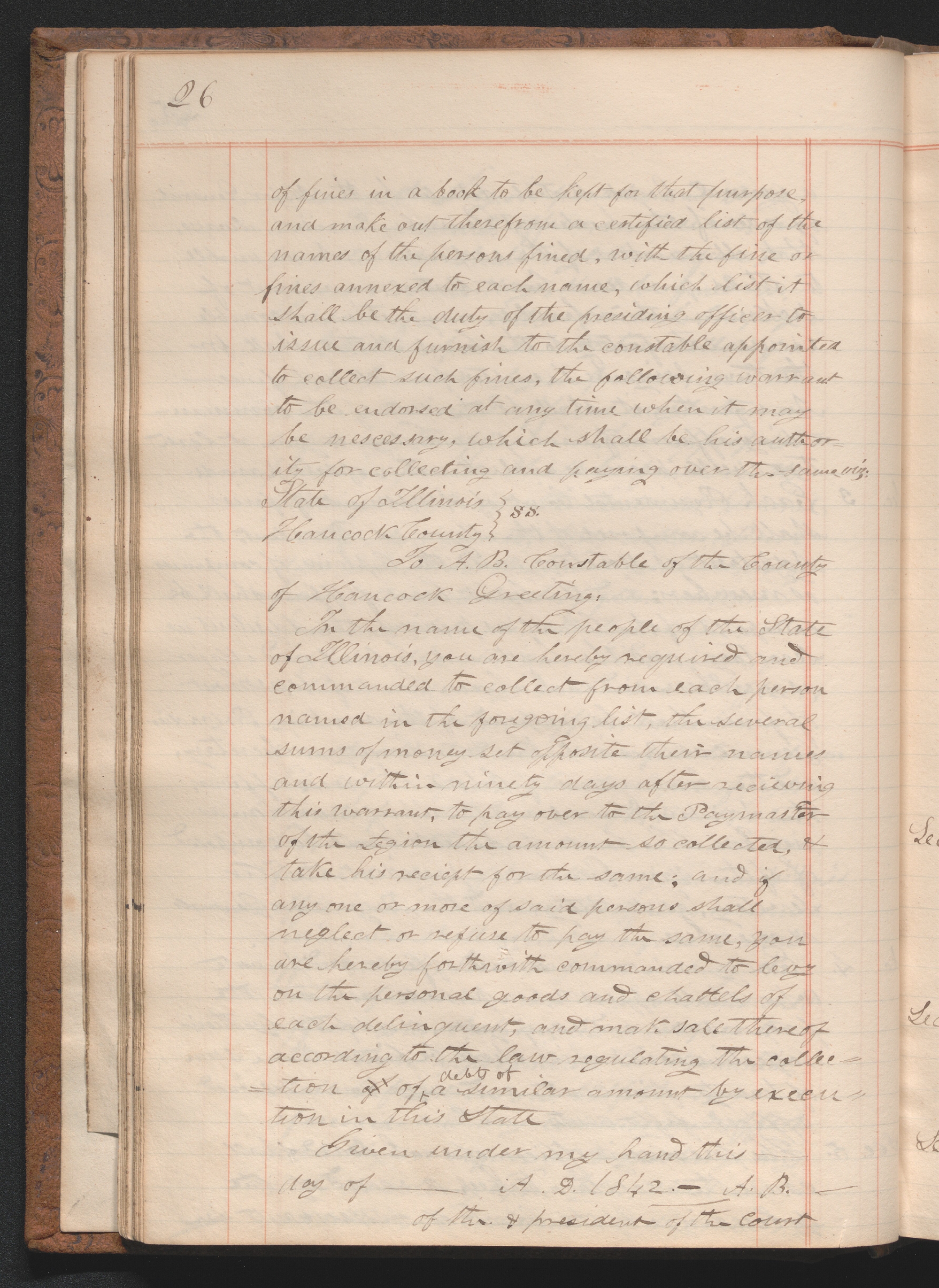 Before inscribing the minutes of the ’s meetings—which began on 4 February 1841 and were designated as courts-martial—into the volume, first inscribed in the book section 25 of “An Act to Incorporate the City of Nauvoo,” which was passed by the legislature in December 1840 and provided the legal authority to create the Nauvoo Legion as an independent body of the state militia, and the City Council’s 3 February 1841 “ordinance organizing the ‘Nauvoo Legion.’” On page 9, following minutes of a court-martial dated 9 March 1841, Stout wrote a note stating that the original drafts of all minutes following 9 March 1841 and prior to 12 March 1842 were missing. Stout speculated that , former major general in the legion and Nauvoo’s first mayor, took the minutes with him when he was cashiered from the legion and left Nauvoo. Stout dated this note 8 December 1843. It is possible that he inscribed all the text in the book previous to this note on or shortly before 8 December 1843. The minutes continue sporadically until 20 October 1844. Changes in ink density suggest that the 1844 minutes were kept roughly contemporaneously.