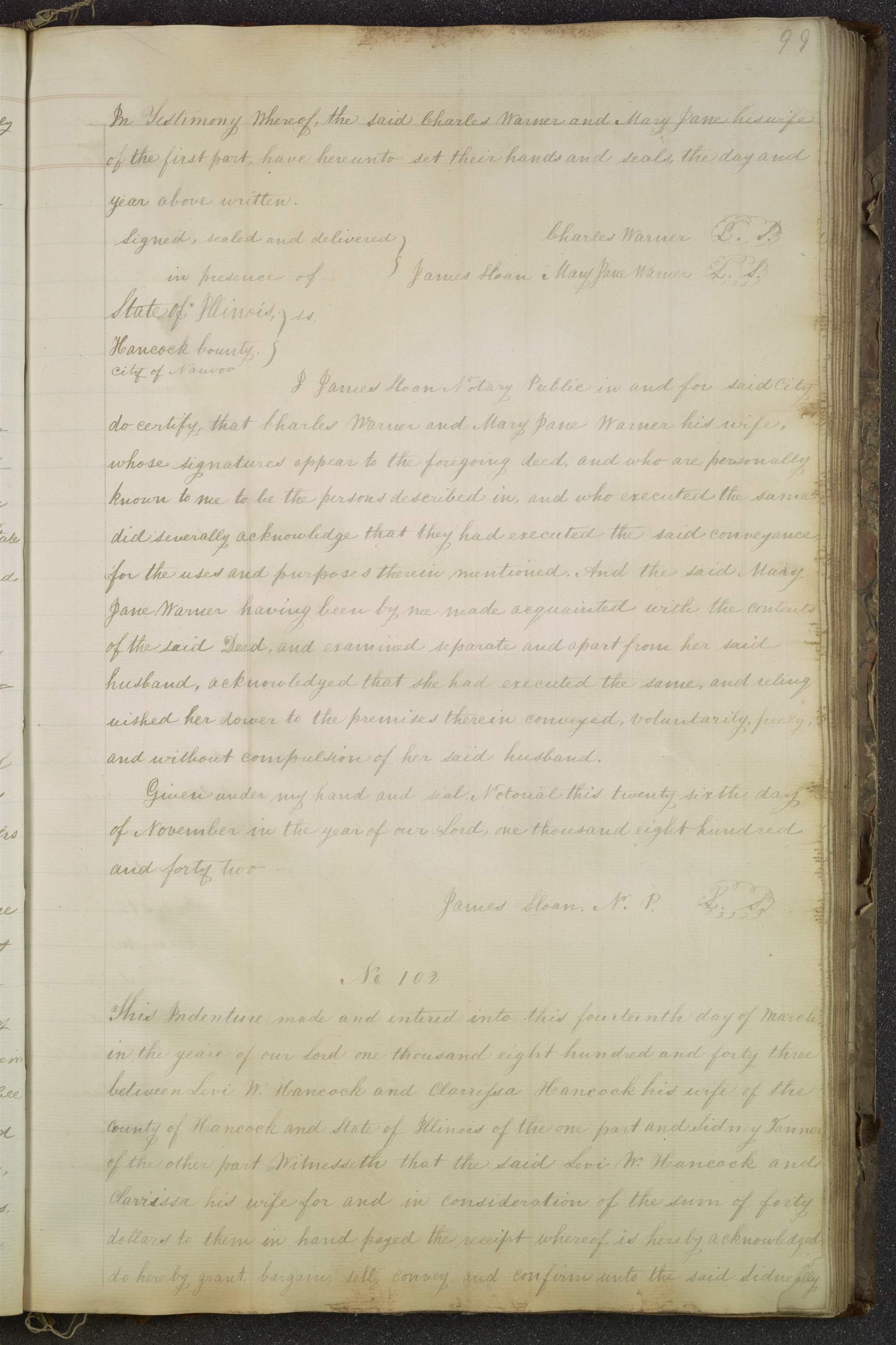 This Indenture made and entered into this fourteenth day of March in the yeare of our Lord one thousand eight hundred and forty three between and Clarrissa [Clarissa Reed] Hancock his wife of the county of and State of of the one part and of the other part Witnesseth that the said and Clarrissa his wife for and in consideration of the sum of forty dollars to them in hand payed the receipt whereof is hereby acknowledged do hereby grant, bargain, sell, convey, and confirm unto the said [p. 99]