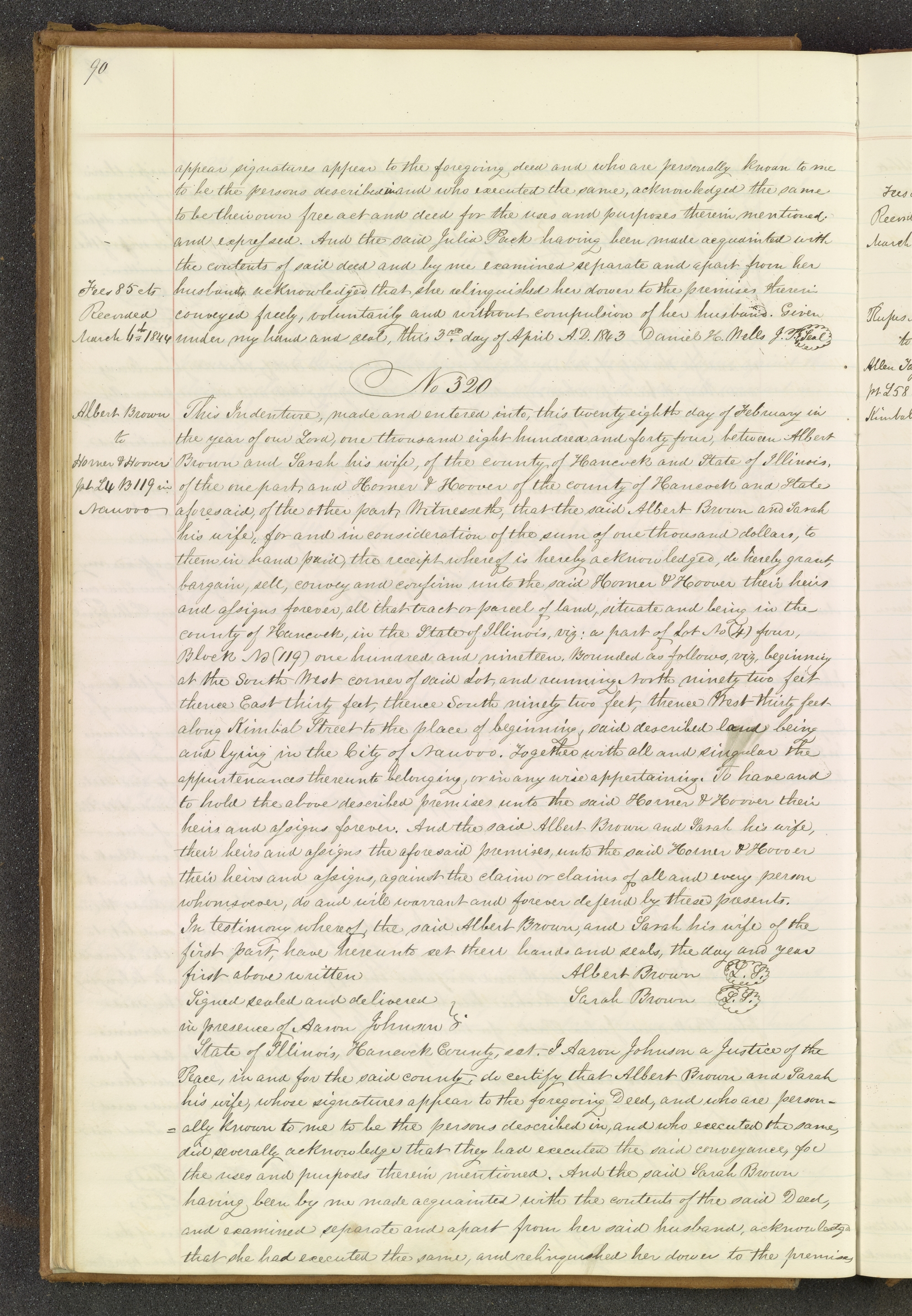 This Indenture, made and entered into, this twenty eighth day of February in the year of our Lord, one thousand eight hundred and forty four, between and Sarah [Campbell Brown] his wife, of the county of and State of , of the one part, and & Hoover of the county of and aforesaid, of the other part, Witnesseth, that the said and Sarah his wife, for and in consideration of the sum of one thousand dollars, to them in hand paid, the receipt whereof is hereby acknowledged, do hereby grant, bargain, sell, convey and confirm unto the said & Hoover their heirs and assigns forever, all that tract or parcel of land, situate and being in the county of , in the State of , viz: a part of Lot No (4) four, Block No (119) one hundred and nineteen. Bounded as follows, viz, beginning at the South West corner of said Lot, and running North ninety two feet thence East thirty feet, thence South ninety two feet, thence West thirty feet along Kimbal Street to the place of beginning, said described land being and lying in the City of . Together with all and singular the appurtenances thereunto belonging, or in any wise appertaining. To have and to hold the above described premises unto the said & Hoover their heirs and assigns forever. And the said and Sarah his wife, their heirs and assigns the aforesaid premises, unto the said & Hoover their heirs and assigns, against the claim or claims of all and every person whomsoever, do and will warrant and forever defend by these presents.