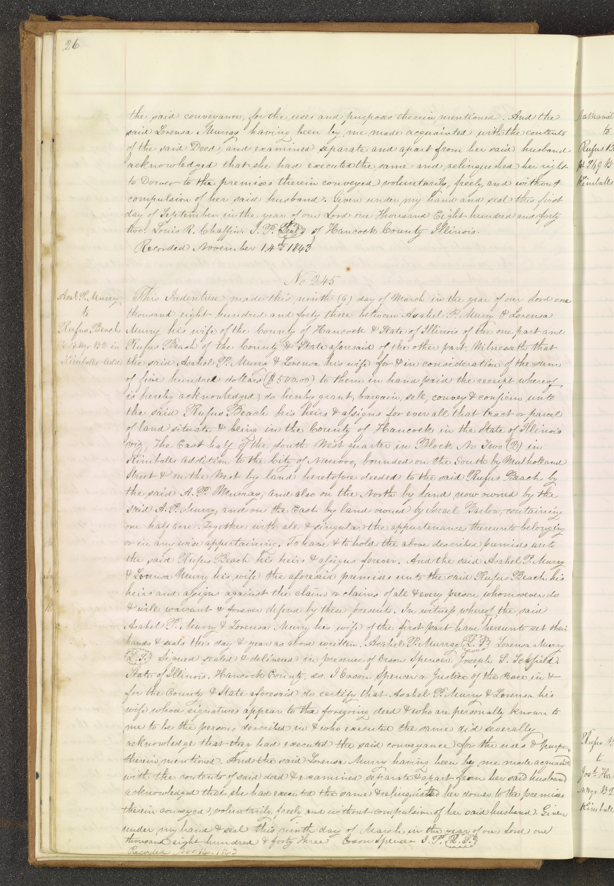 the said conveyance, for the uses and purposes therein mentioned. And the said Lorensa Murray having been by me made acquainted with the contents of the said Deed, and examined separate and apart from her said acknowledged that she had executed the same and relinquished her right to Dower to the premises therein conveyed voluntarily, freely, and without compulsion of her said . Given under my hand and seal this first day of September in the year of our Lord one Thousand Eight hundred and forty two. . J. P. Seal of Illinois.