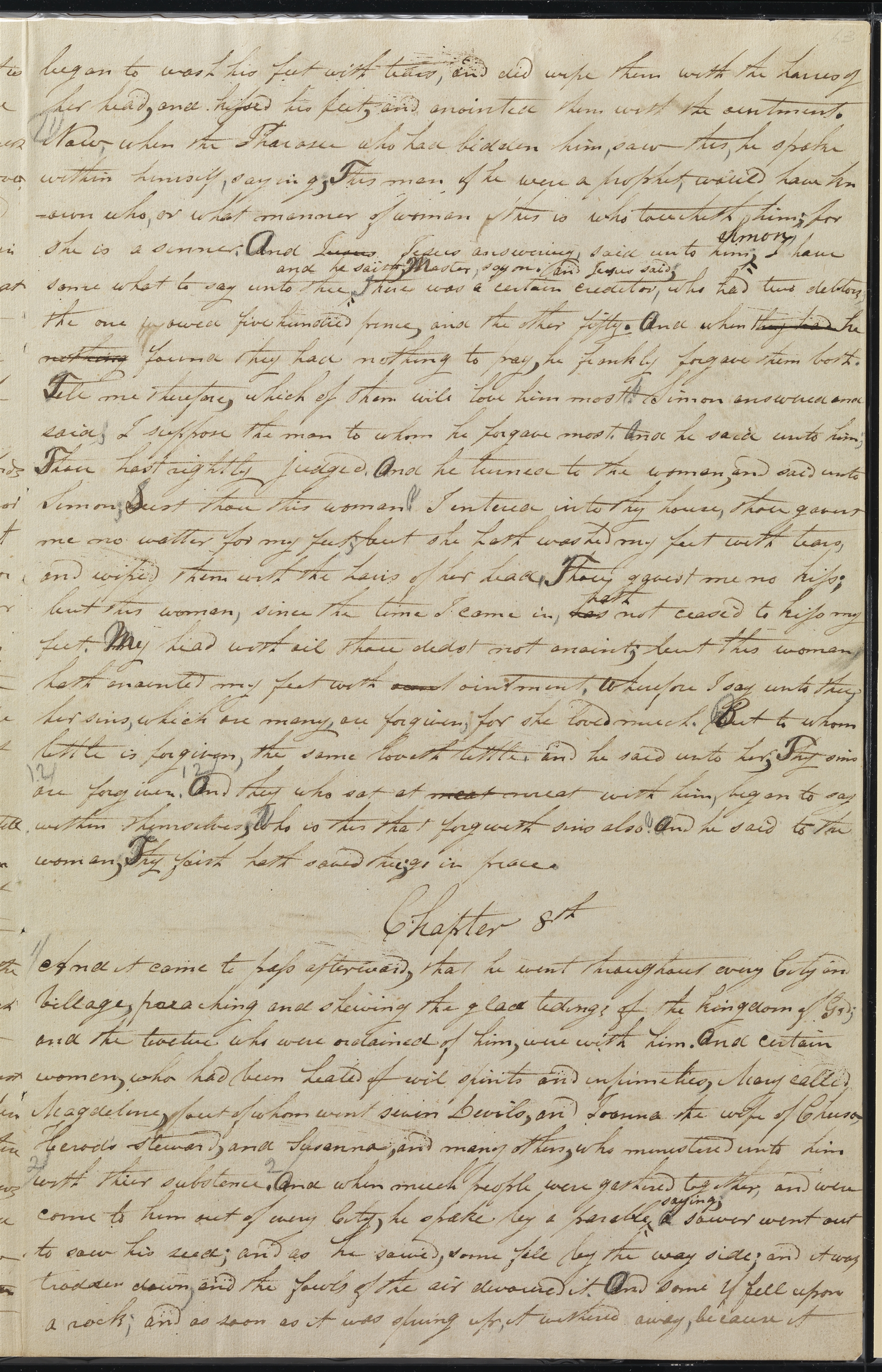 <1/> And it came to pass afterward, that he went throughout every City and Village, preaching and shewing the glad tidings of the kingdom of God; and the twelve who were ordained of him, were with him. And certain women, who had been healed of evil spirits and infirmeties, Mary called Magdelene, of out of whom went seven Devils, and Joanna the wife of Chusa, Herod’s steward, and Susanna, and many others, who ministered unto him <2/> with their substance. <2/> And when much people were gathered together, and were come to him out of every City, he spake by a parable <saying,> A sower went out to sow his seed; and as he sowed, some fell by the way side; and it was trodden down, and the fowls of the air devoured it. And some fell upon a rock; and as soon as it was sprung up, it withered away, because it [p. 63 (second numbering)]