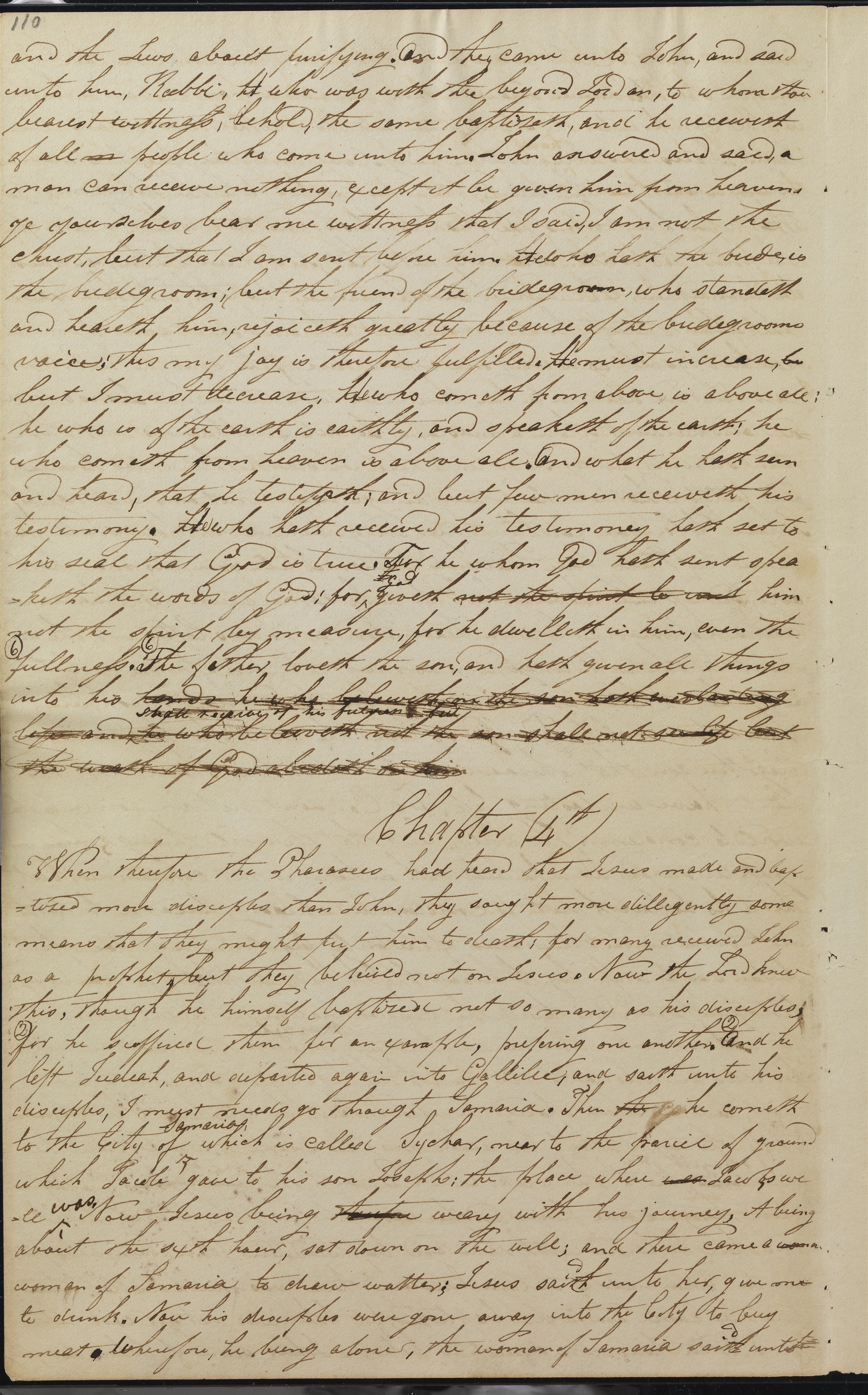 When therefore the Pharasees had heard that Jesus made and baptized more disciples than John, they sought more dillegently some means that they might put him to death; for many received John as a prophet, but they beleived not on Jesus. Now the Lord knew this, though he himself baptized not so many as his disciples, <2> for he suffered them for an example, prefering one another. <2> And he left Judeah, and departed again into Gallilee, and saith unto his disciples, I must needs go through Samaria. Then the co he cometh to the City of <Samaria,> which is called Sychar, near to the parcil of ground which Jacob gave to his son Joseph; the place where was Jacob’s well <was.> Now Jesus being therefore weary with his journey, it being about the sixth hour, sat down on the well; and there came a woman woman of Samaria to draw watter; Jesus saith <said> unto her, give me to drink. Now his disciples were gone away into the City to buy meat. Wherefore, he being alone, the woman of Samaria saith <said> unto him [p. 110 (second numbering)]