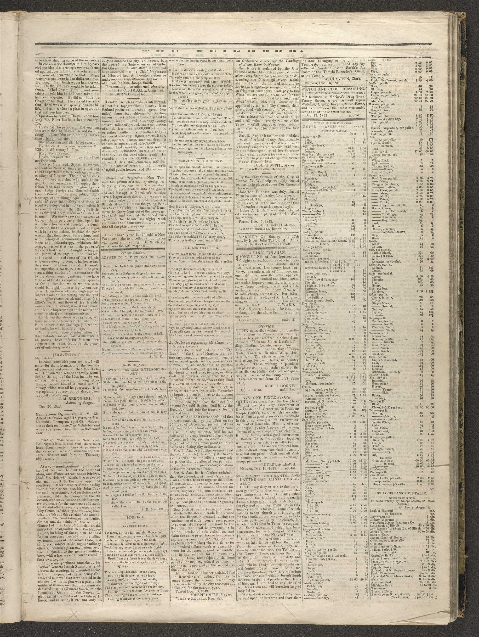 , Notice, , Hancock Co., IL, 16 Dec. 1843. Featured version published [ca. 20 Dec. 1843] in “Notice to Emigrants and Latter-day Saints Generally,” Nauvoo Neighbor (Nauvoo, Hancock Co., IL), 20 Dec. 1843, vol. 1, no. 34, [3]. For more complete source information, see the source note for Notice, 26 Aug. 1843.