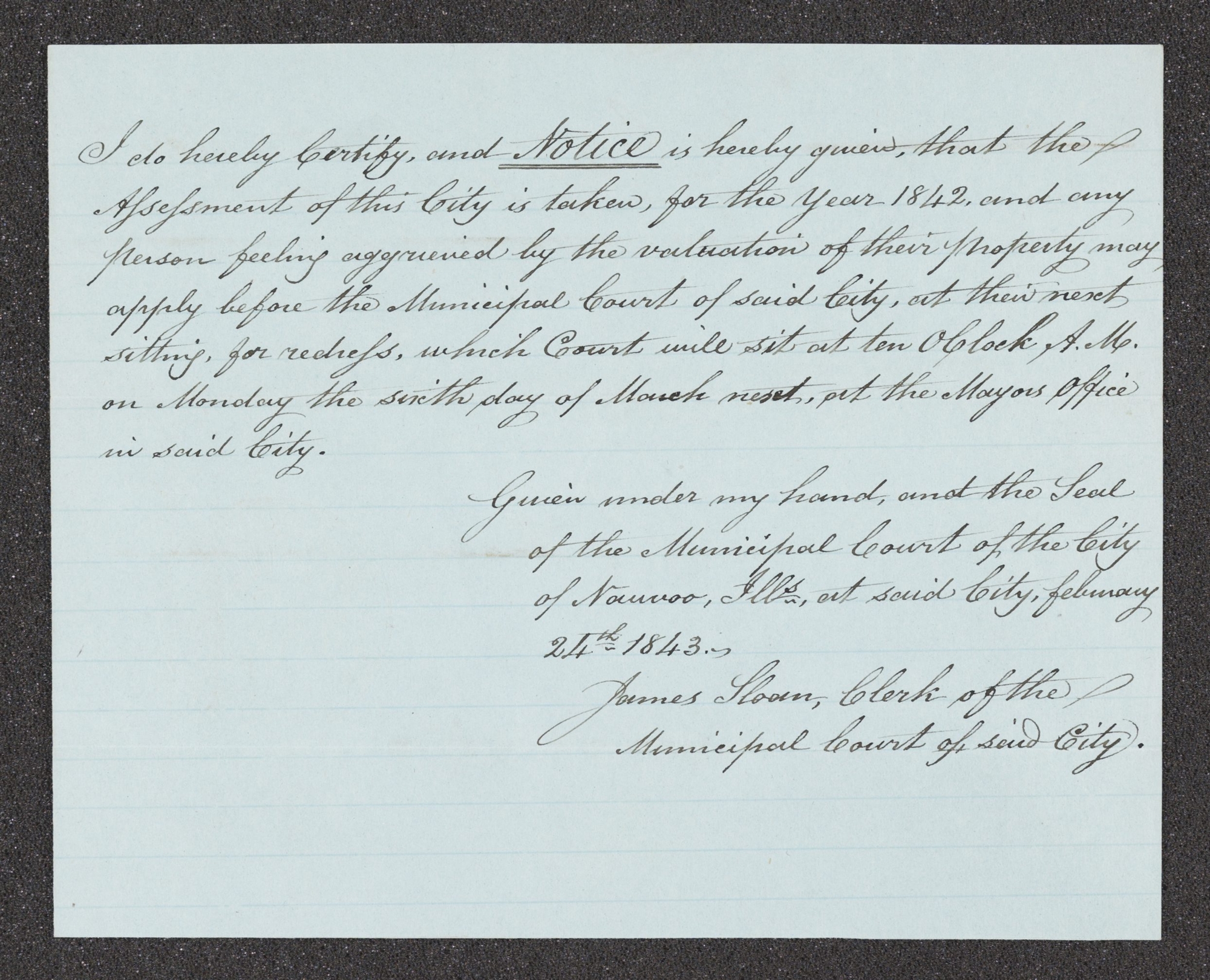 , Notice, , Hancock Co., IL, 24 Feb. 1843; handwriting of ; certified by , 24 Feb. 1843; docket in handwriting of ; one page; Nauvoo, IL, Records, 1841–1845, CHL.