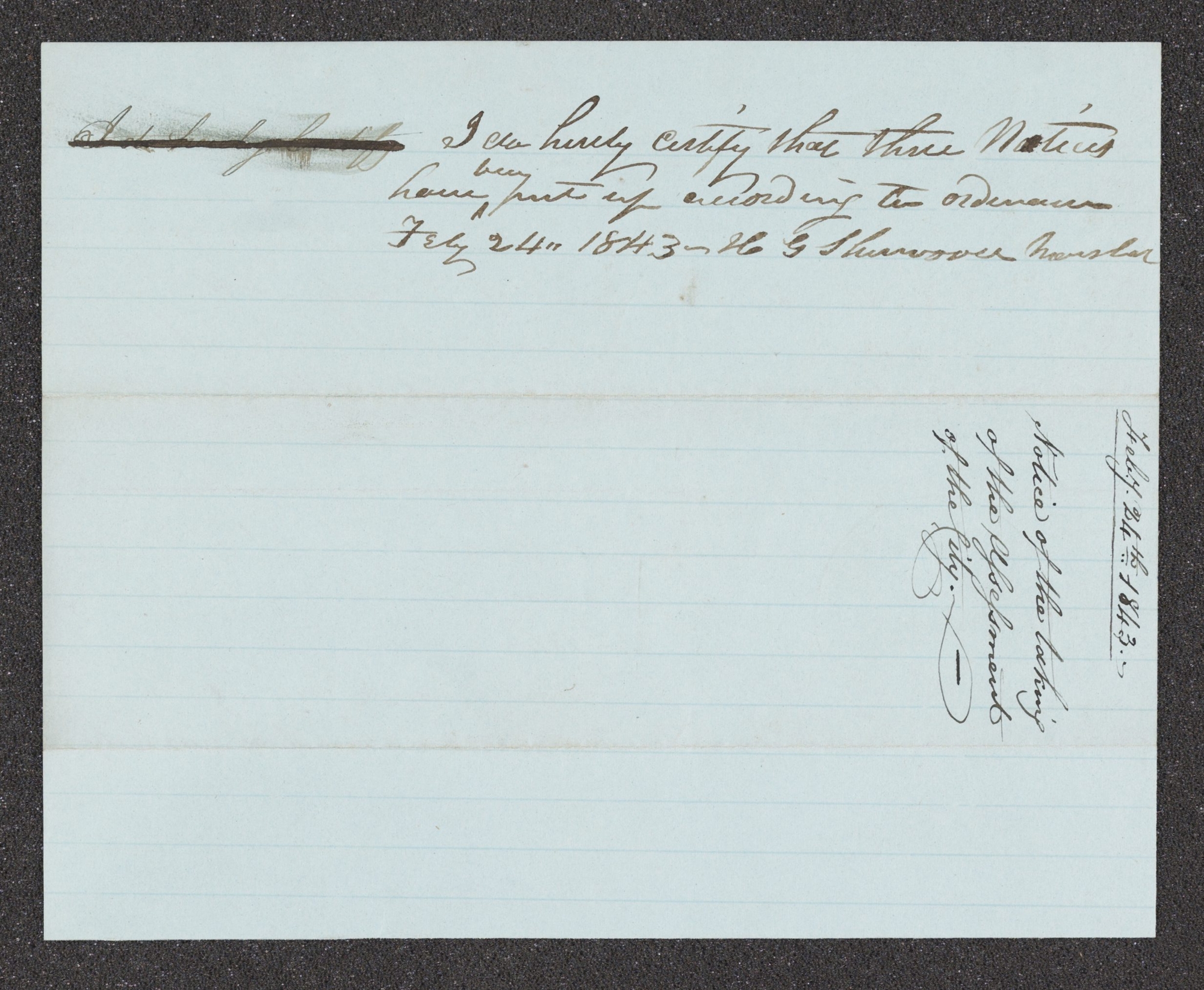 I do hereby Certify I do hereby certify that three Notices have <been> put up according to ordinance Feby 24. 1843— Marshal