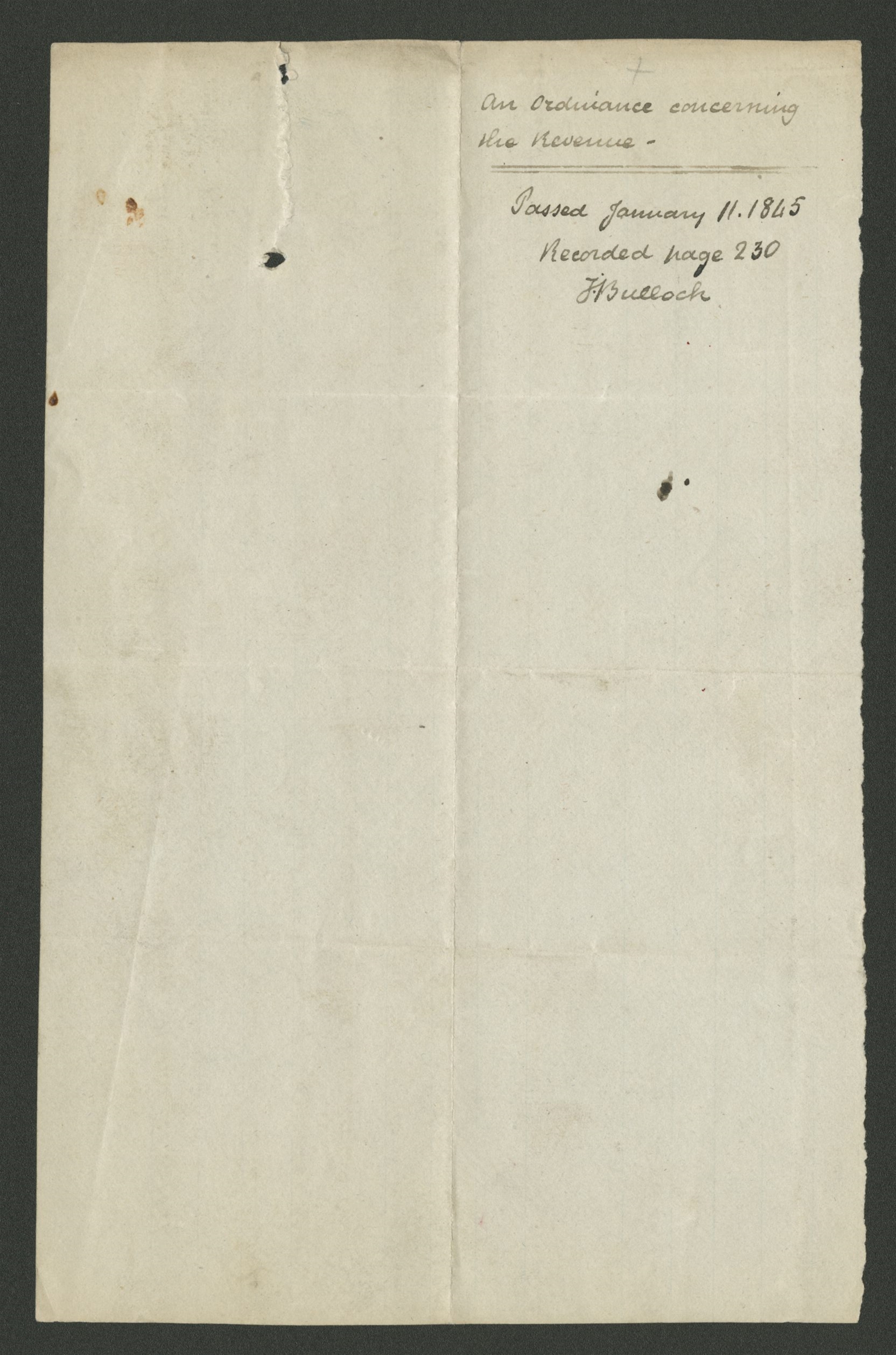 Nauvoo City Council, Ordinance, , Hancock Co., IL, 11 Jan. 1845; handwriting of ; signature of ; endorsements and docket in handwriting of ; one page; Nauvoo, IL, Records, 1841–1845, CHL.
