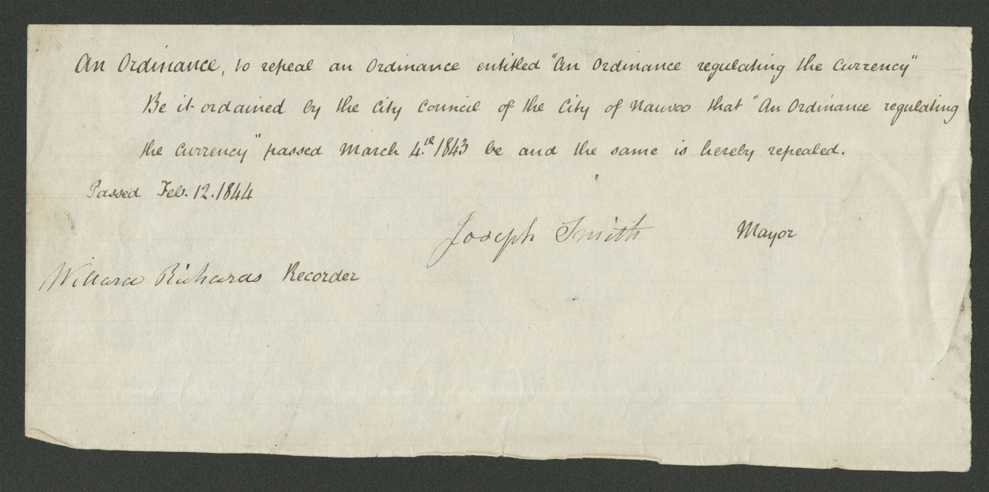 Be it ordained by the City Council of the City of that “An Ordinance regulating the Currency” passed March 4th. 1843 be and the same is hereby repealed.